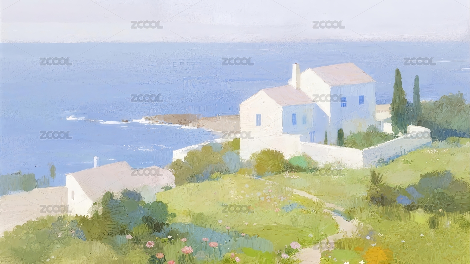 海边乡村油画背景