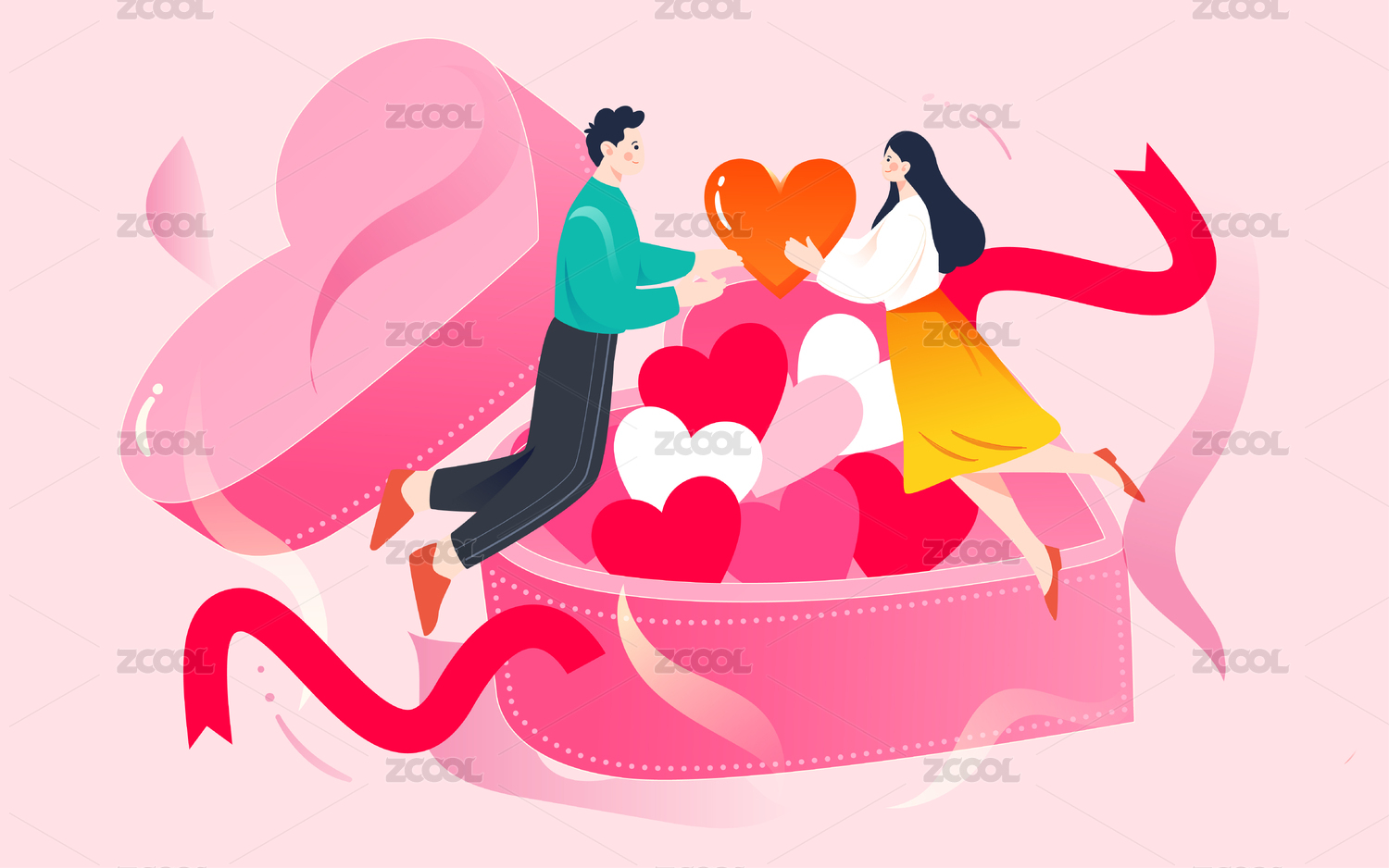 浪漫情人节礼物插画感恩节爱心礼盒活动海报
