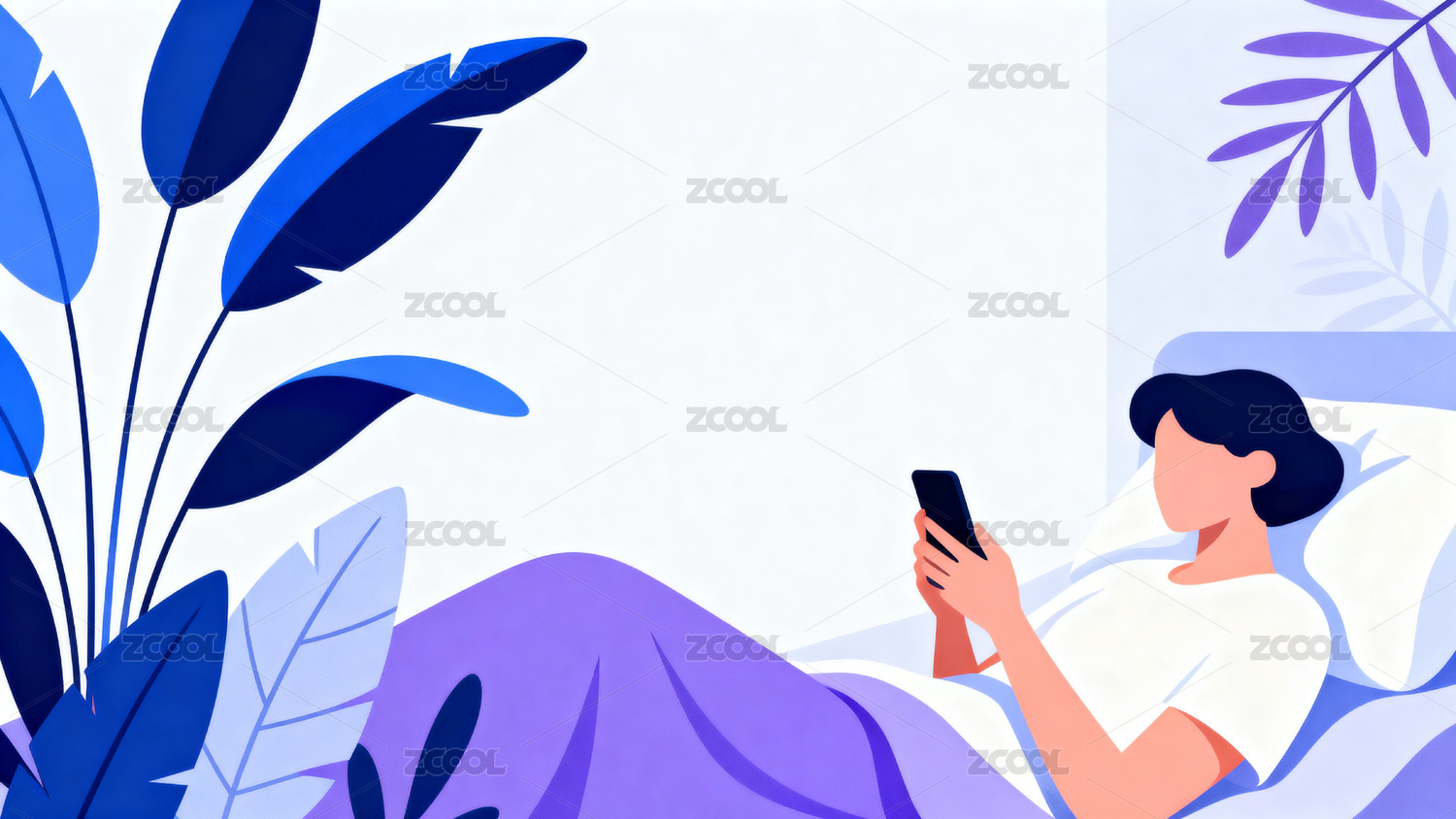 床上男子看手机绿植环绕