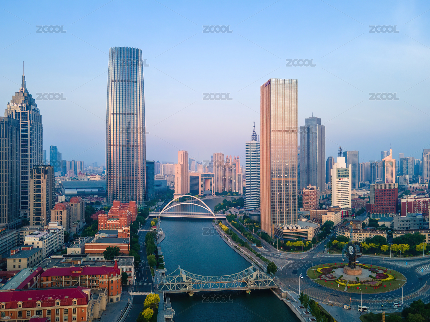 早晨,航拍沐浴在晨光中的天津津湾广场