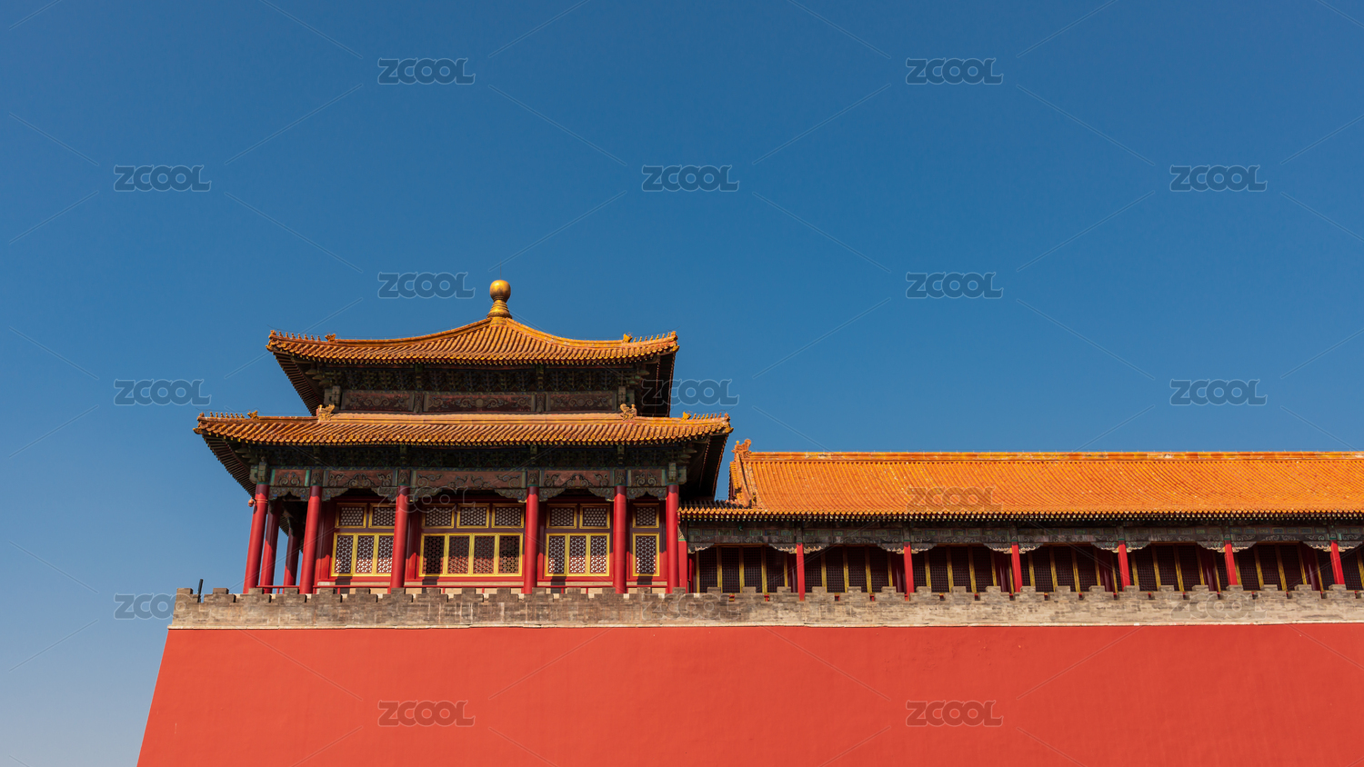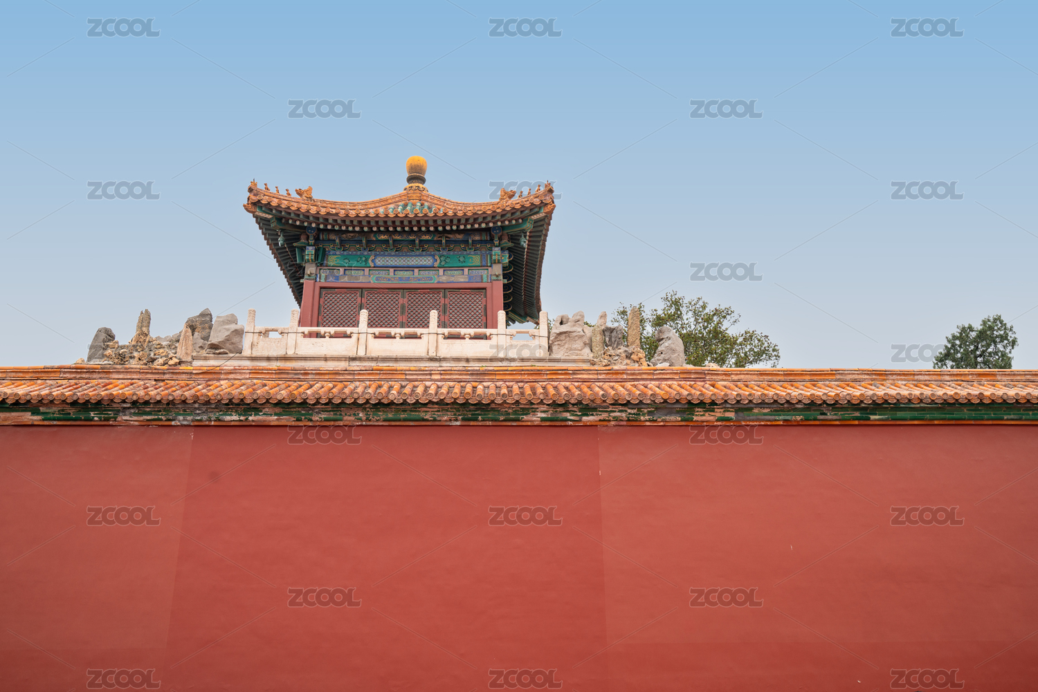 中国北京故宫红色城墙上的东方古代建筑阁楼