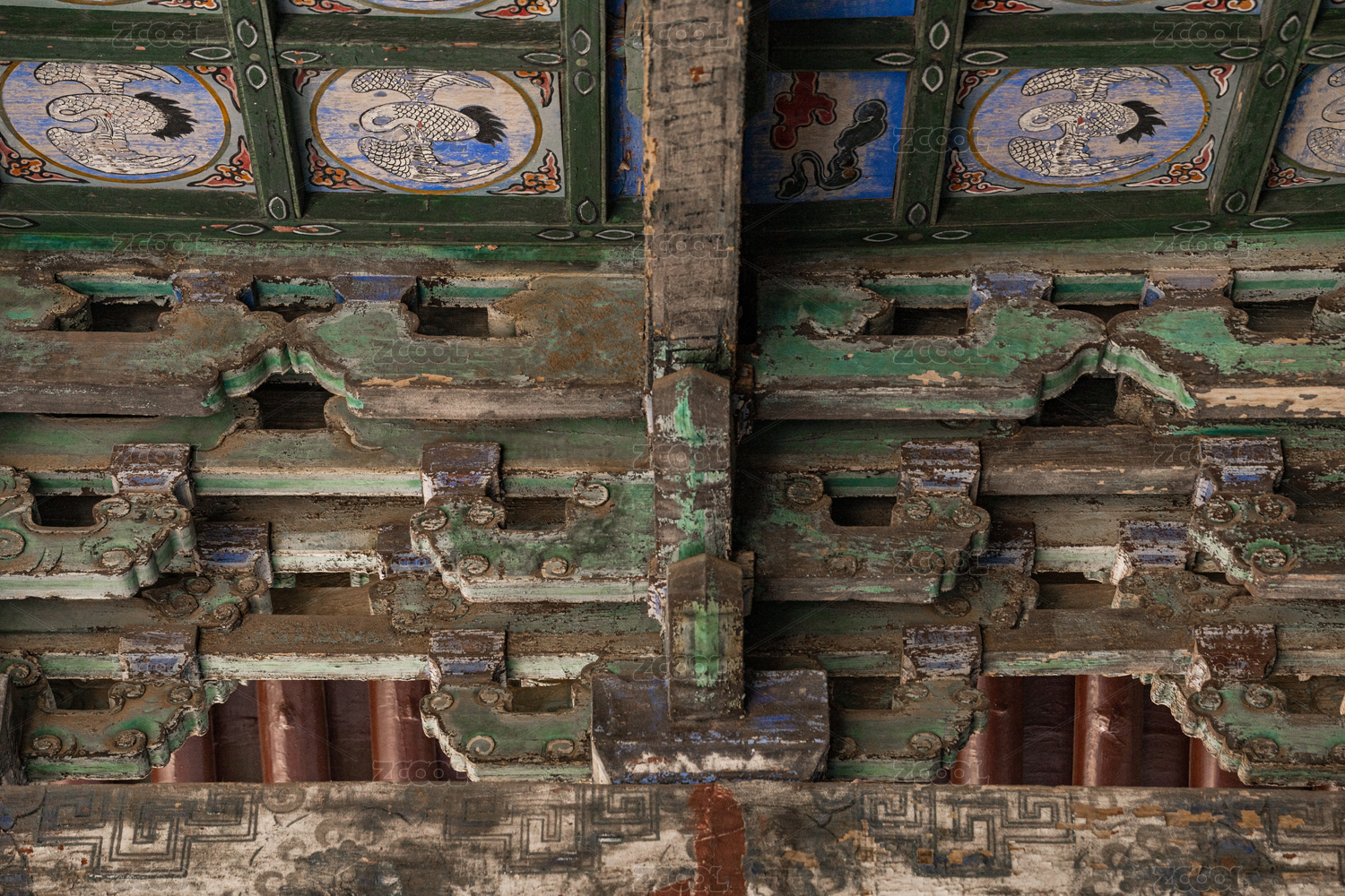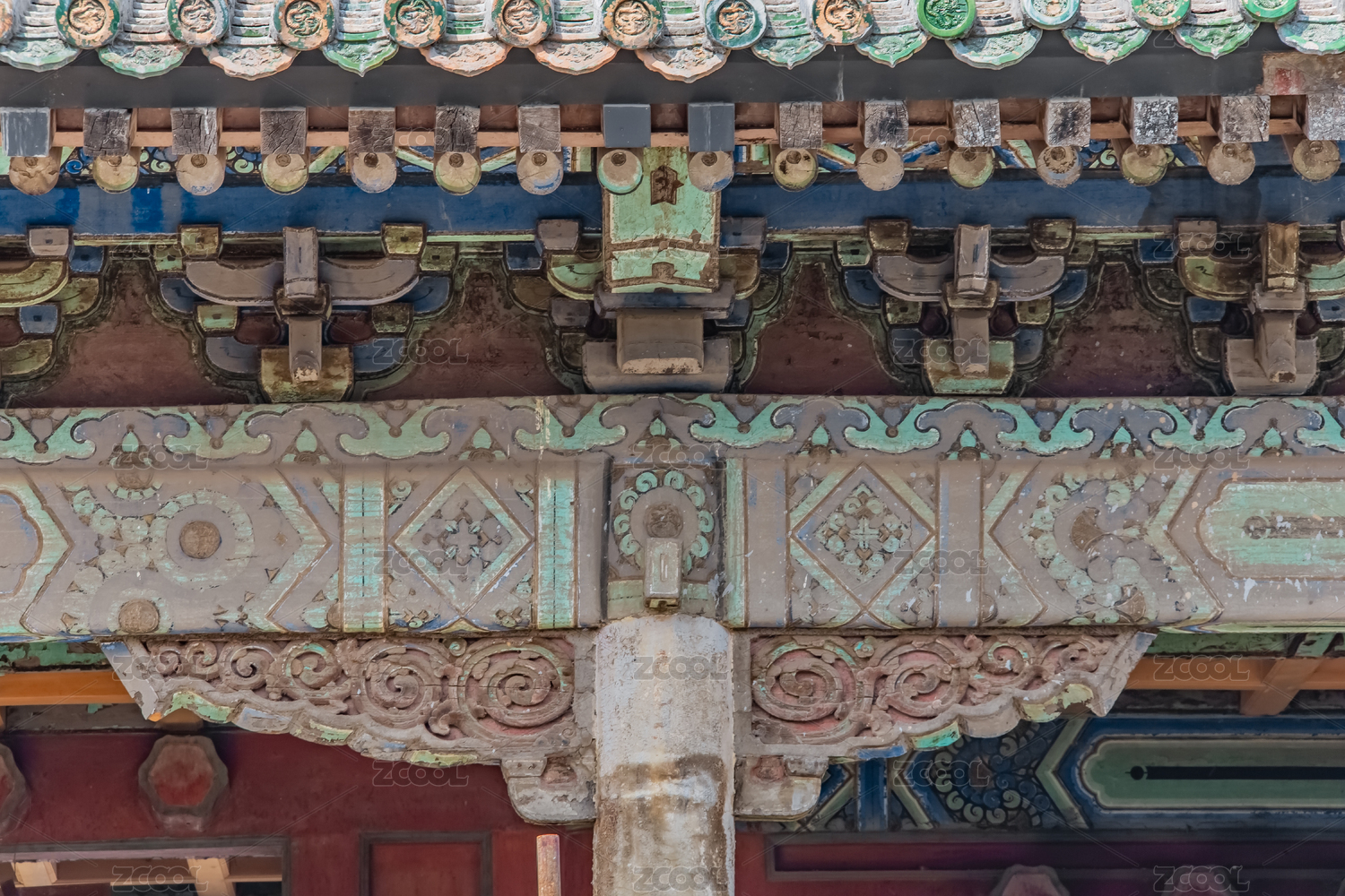 中国山西晋祠古建筑斗拱彩绘雕塑