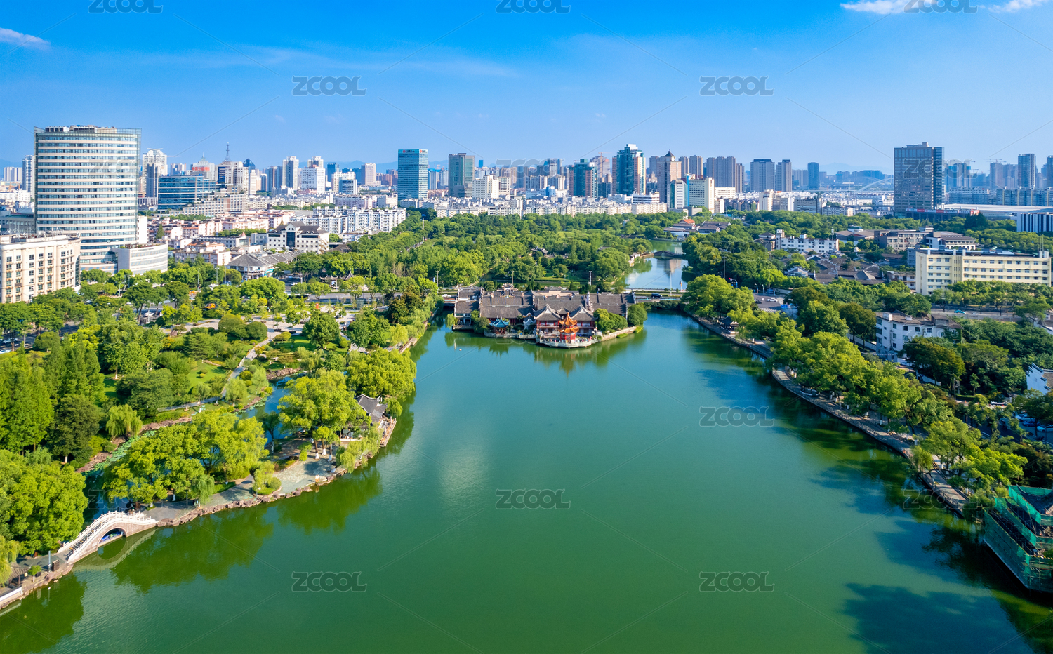 航拍中国浙江省宁波月湖风景区城市风光全景