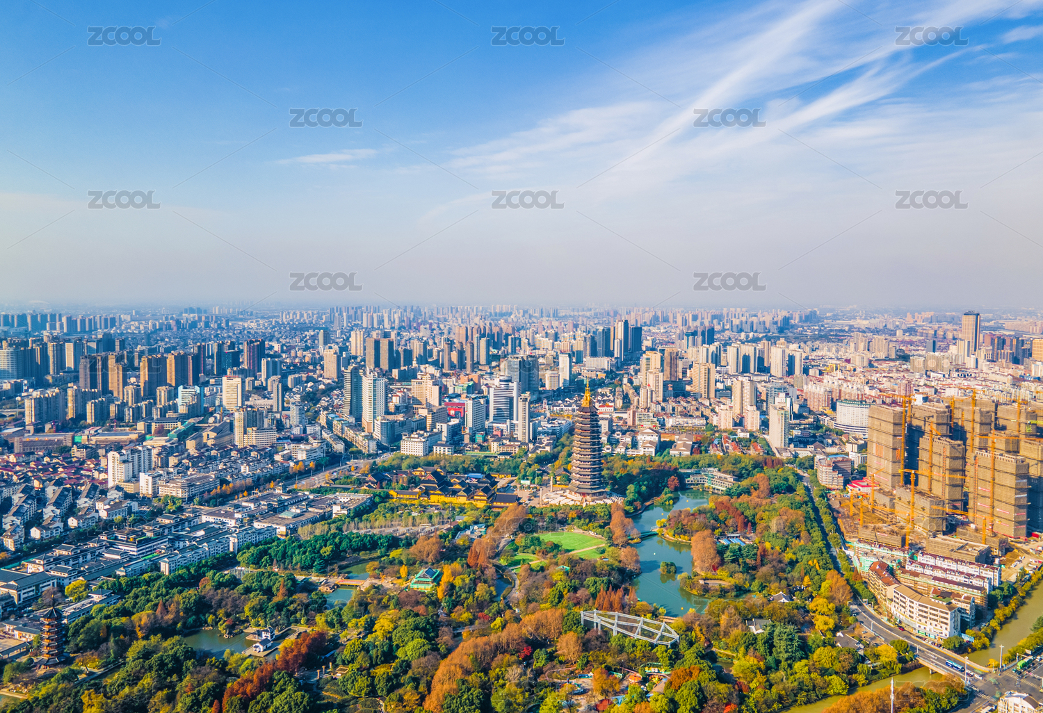 航拍中国江苏省常州红梅公园与天宁寺秋景全景