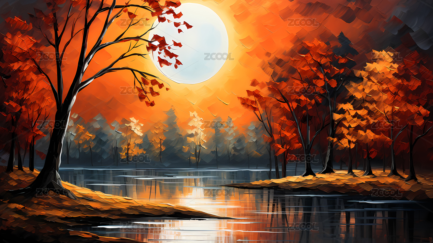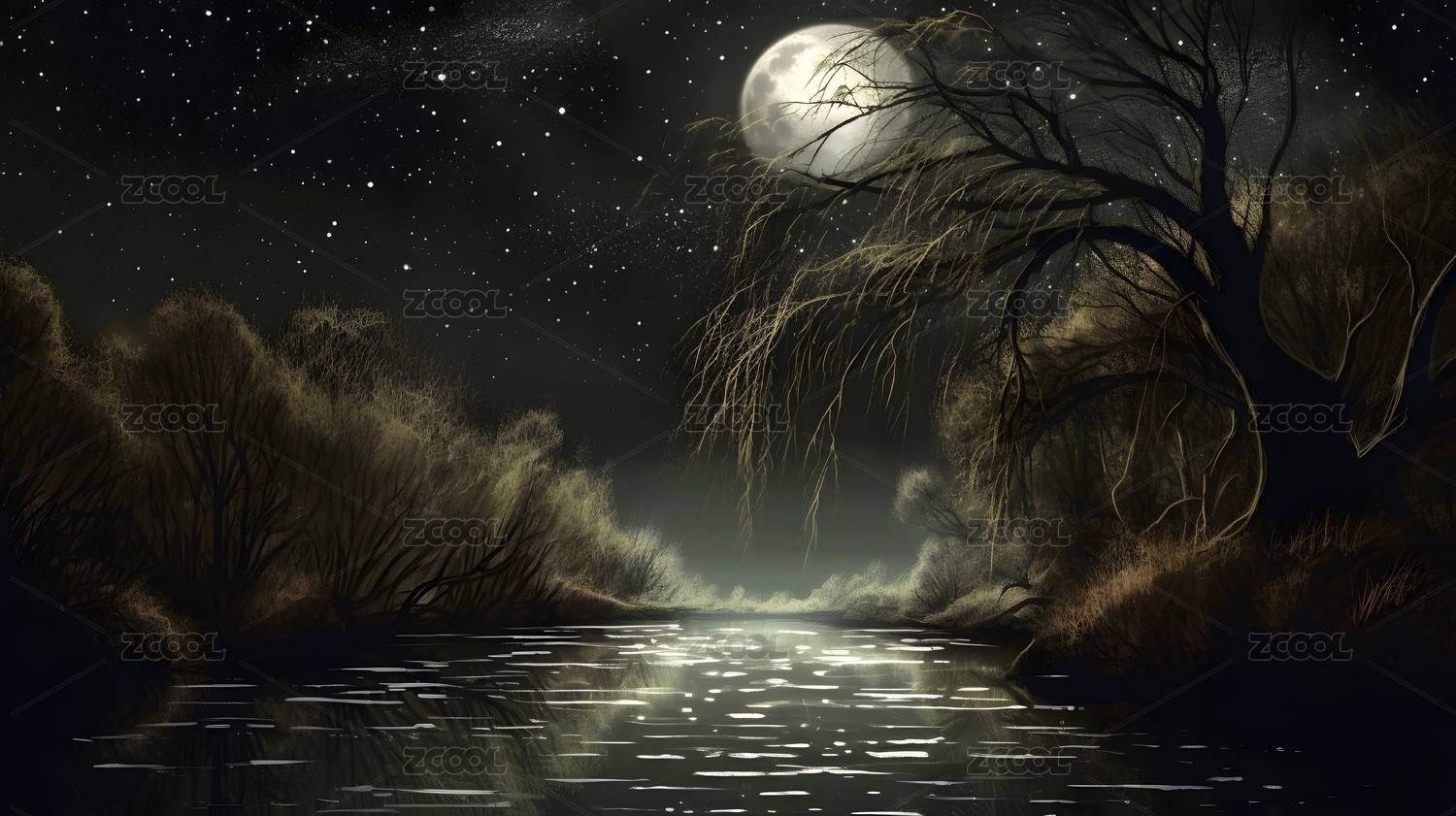 黑色夜晚河边月亮升起的梦幻场景