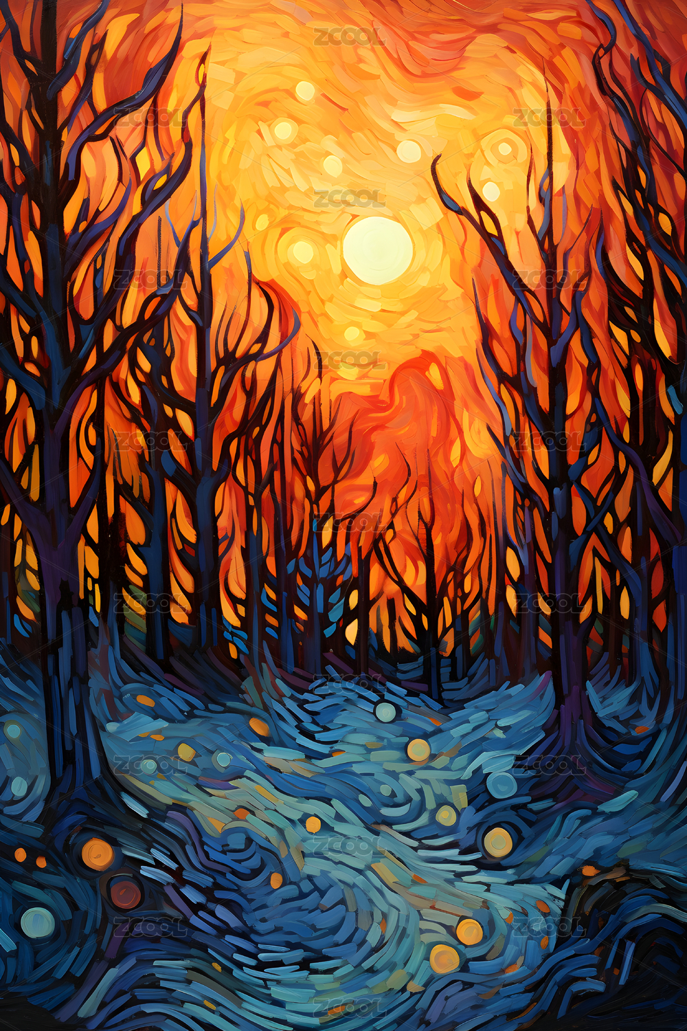 黄昏野外树林森林印象派抽象插画
