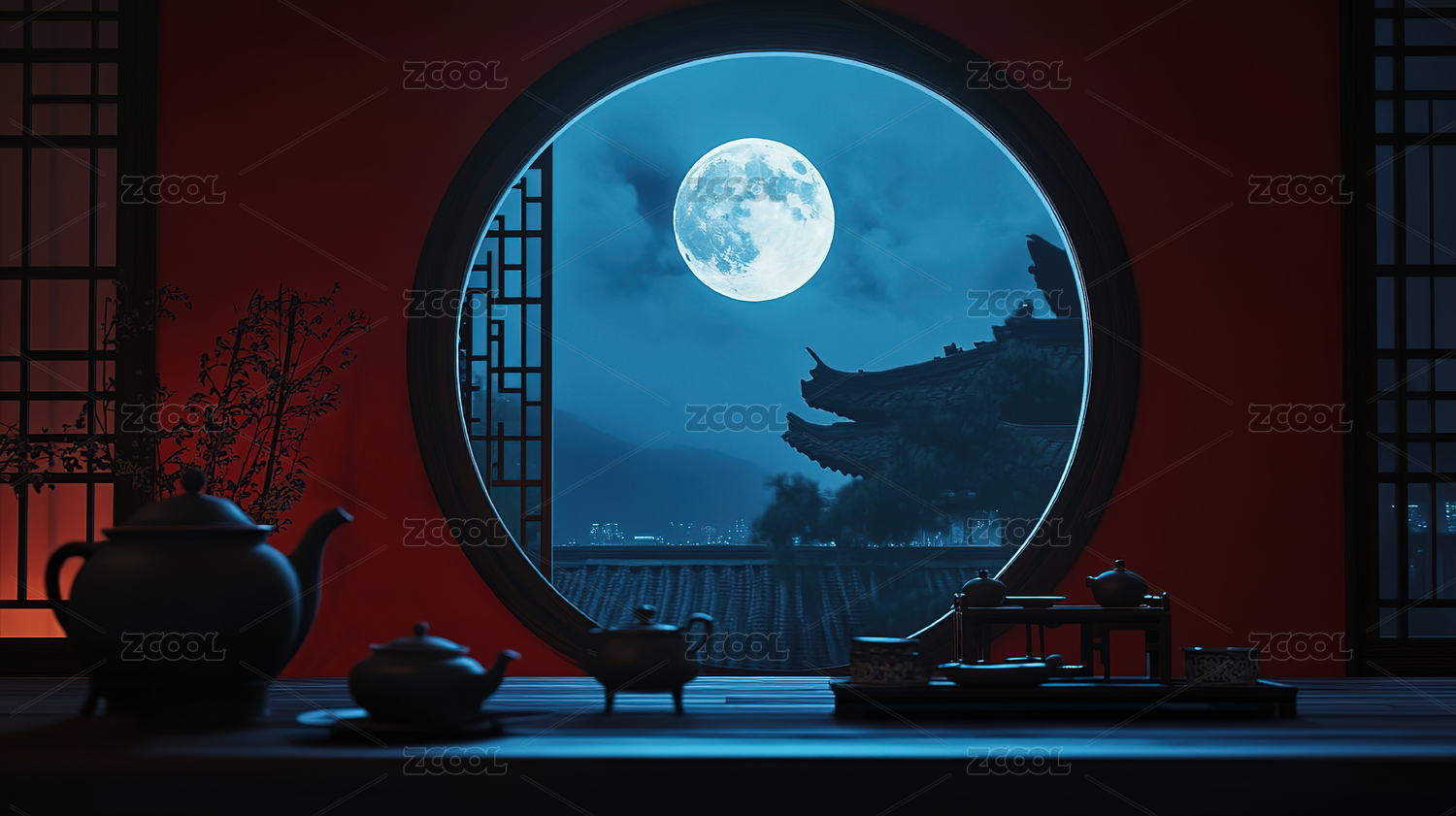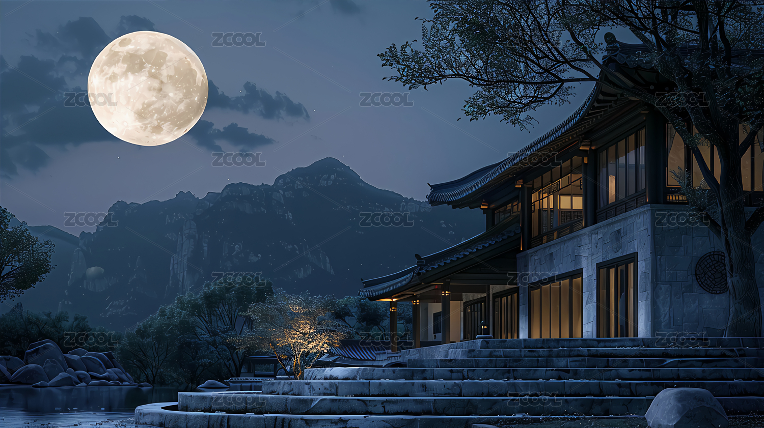 满月,中国风,中秋,团圆,月光,意境,古建筑,祥和,夜色,月色