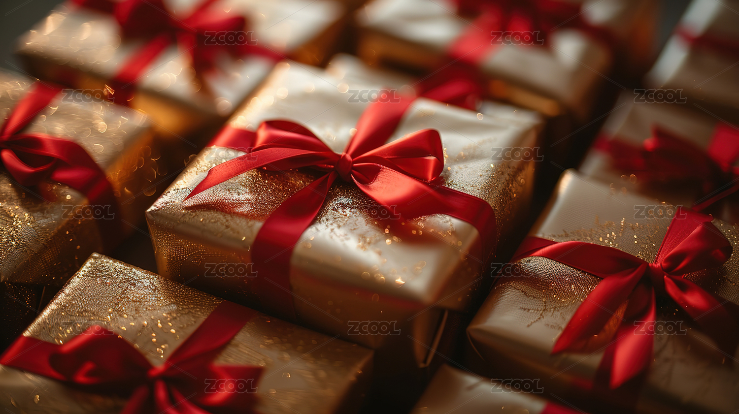 三件包装精美、系有红丝带礼物