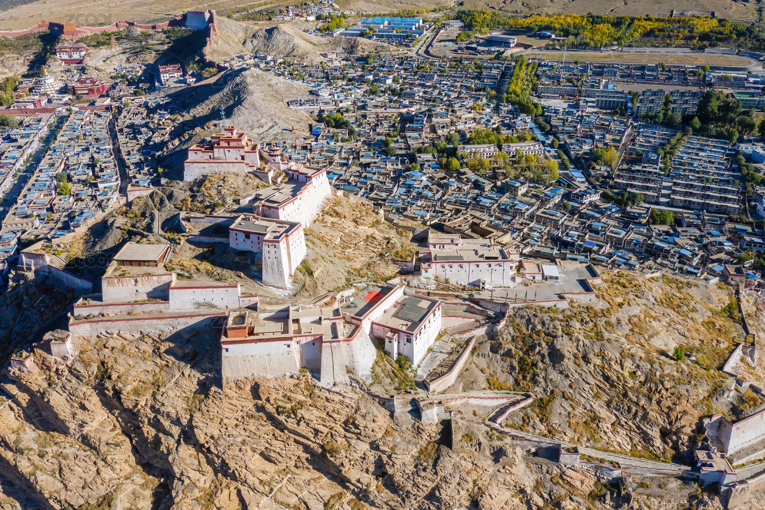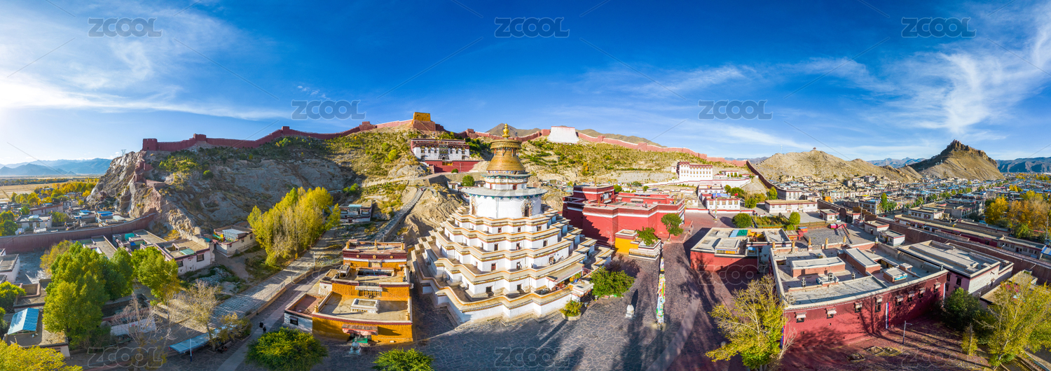 中国西藏江孜县白居寺全景和江孜古城和古堡