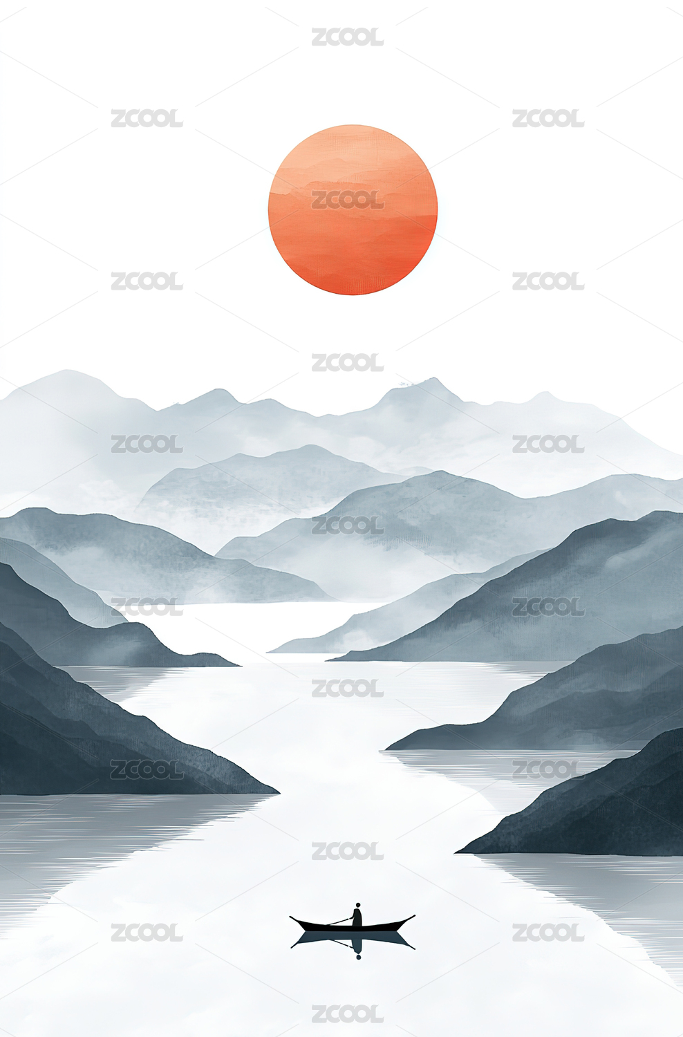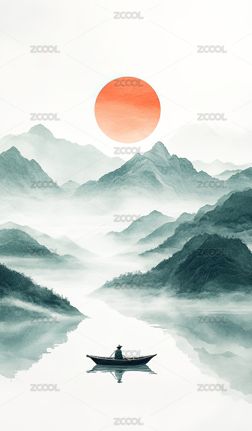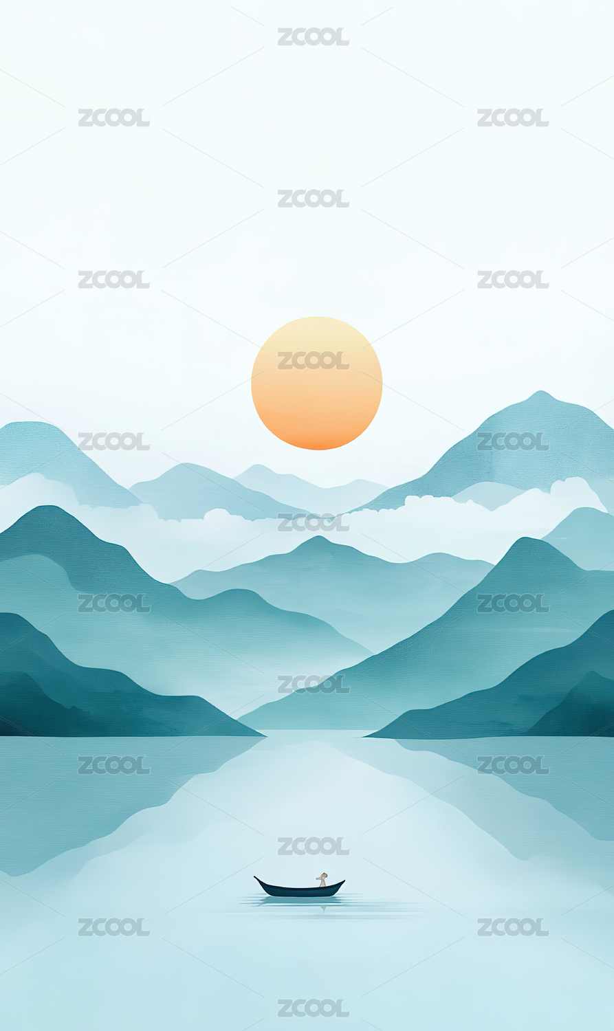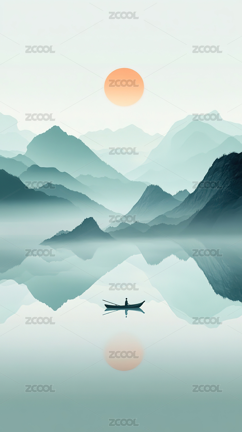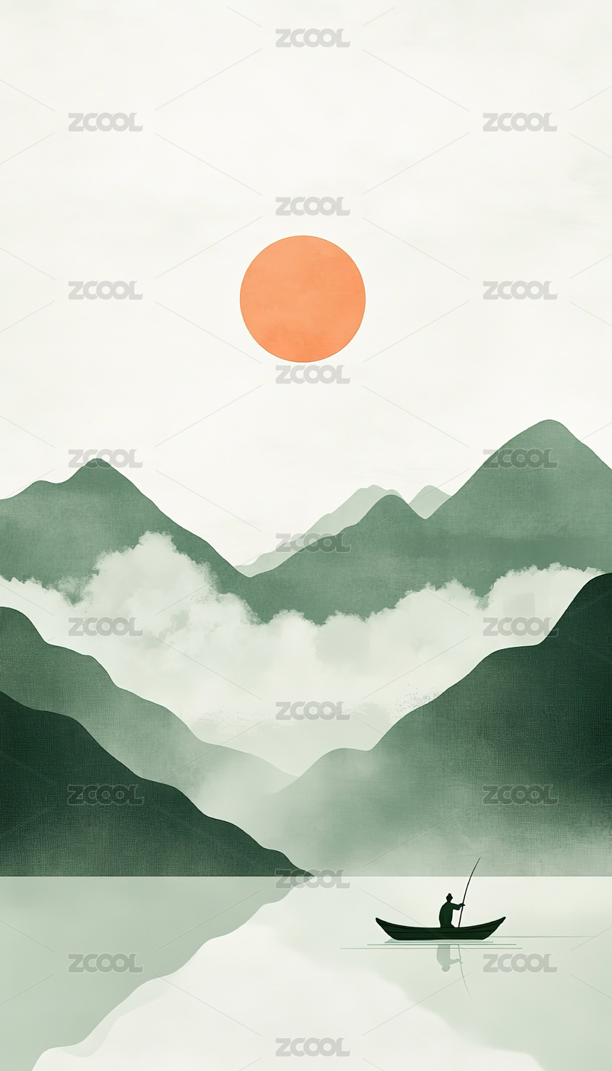 插画,艺术,背景,渔船,写意画,新中式风格,高山,无人,中国文化