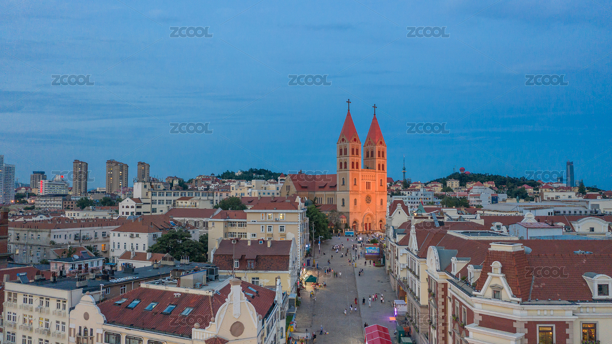 俯视,航拍视角,高视角,夜景,黄昏,夜晚,灯光,浙江路,天主教堂,圣弥厄尔教堂