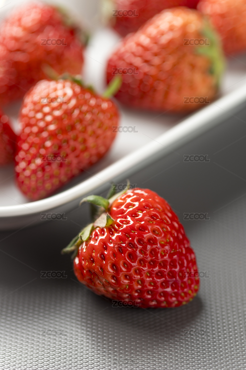 一盘草莓摆放在桌面上特写
