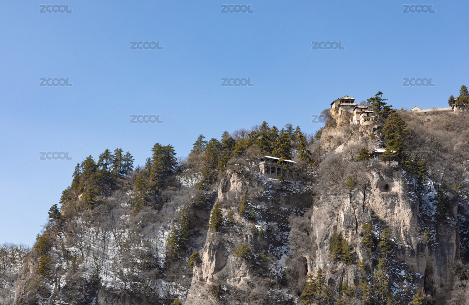 甘肃崆峒山悬崖峭壁高耸山峰上的松树
