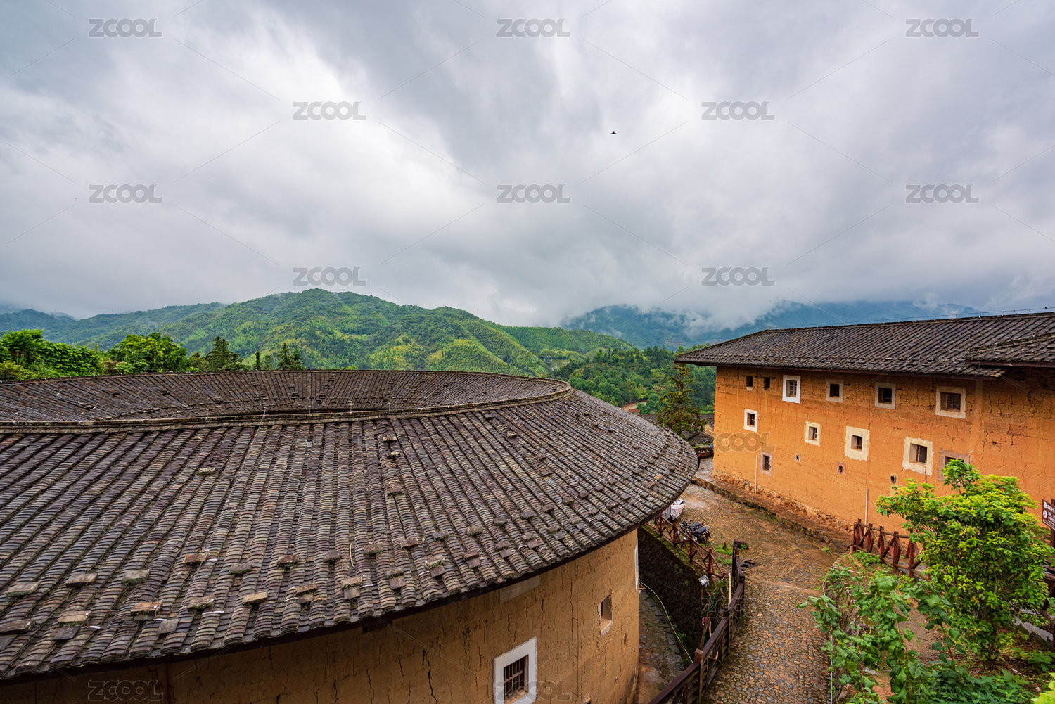 福建省龙岩市永定区湖坑镇南中村下雨天的德馨楼建筑景观