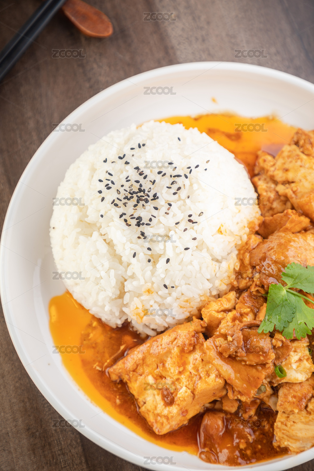 木纹桌上放着一碗鱼杂豆腐盖饭