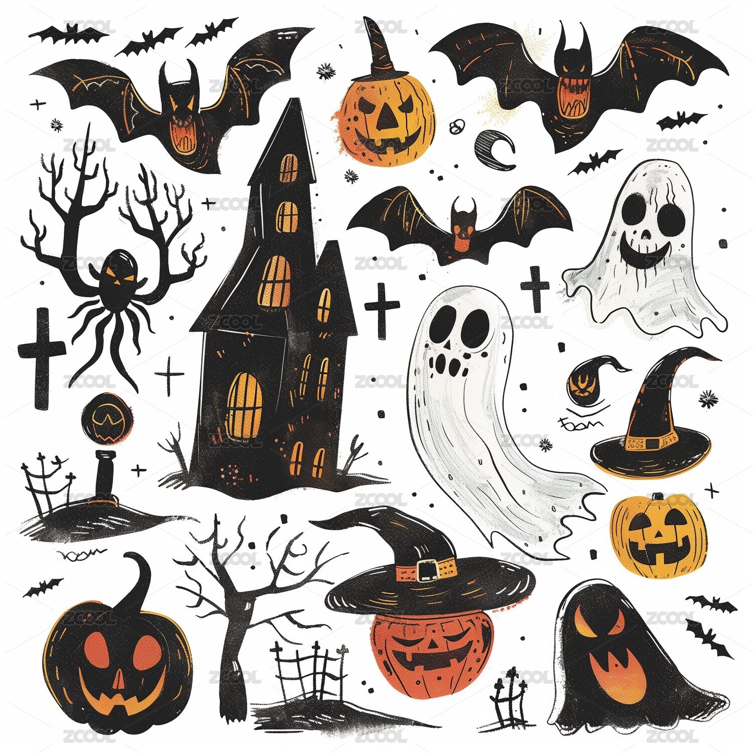 橘色可爱南瓜幽灵墓地蝙蝠蜘蛛网古堡元素