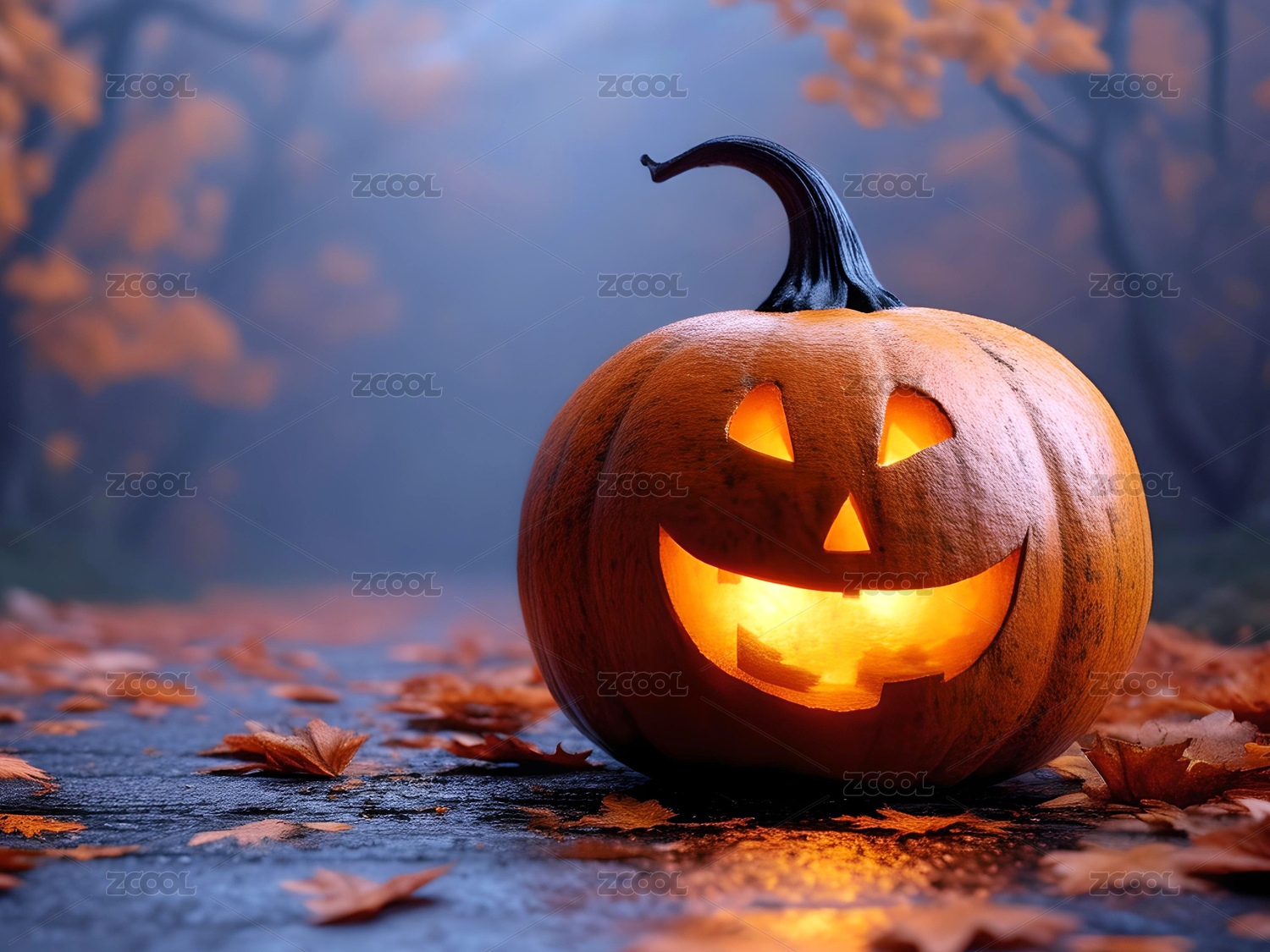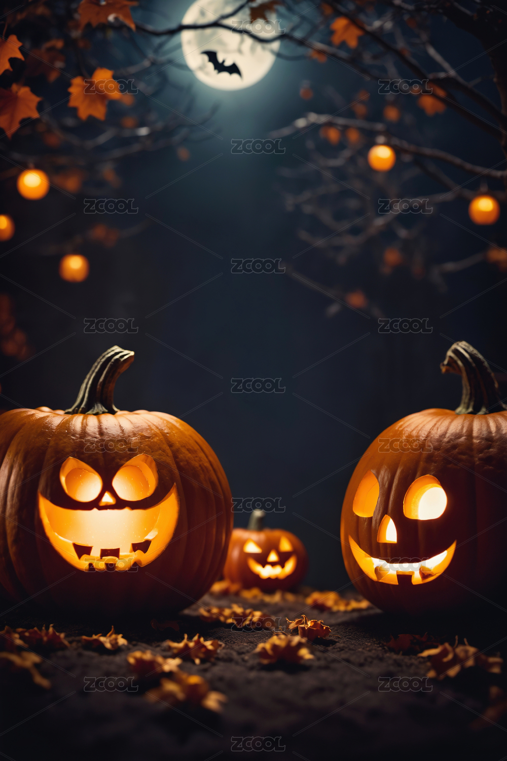 南瓜,灯笼,雕刻,笑脸,夜晚,森林,月亮,蓝色,背景,秋天