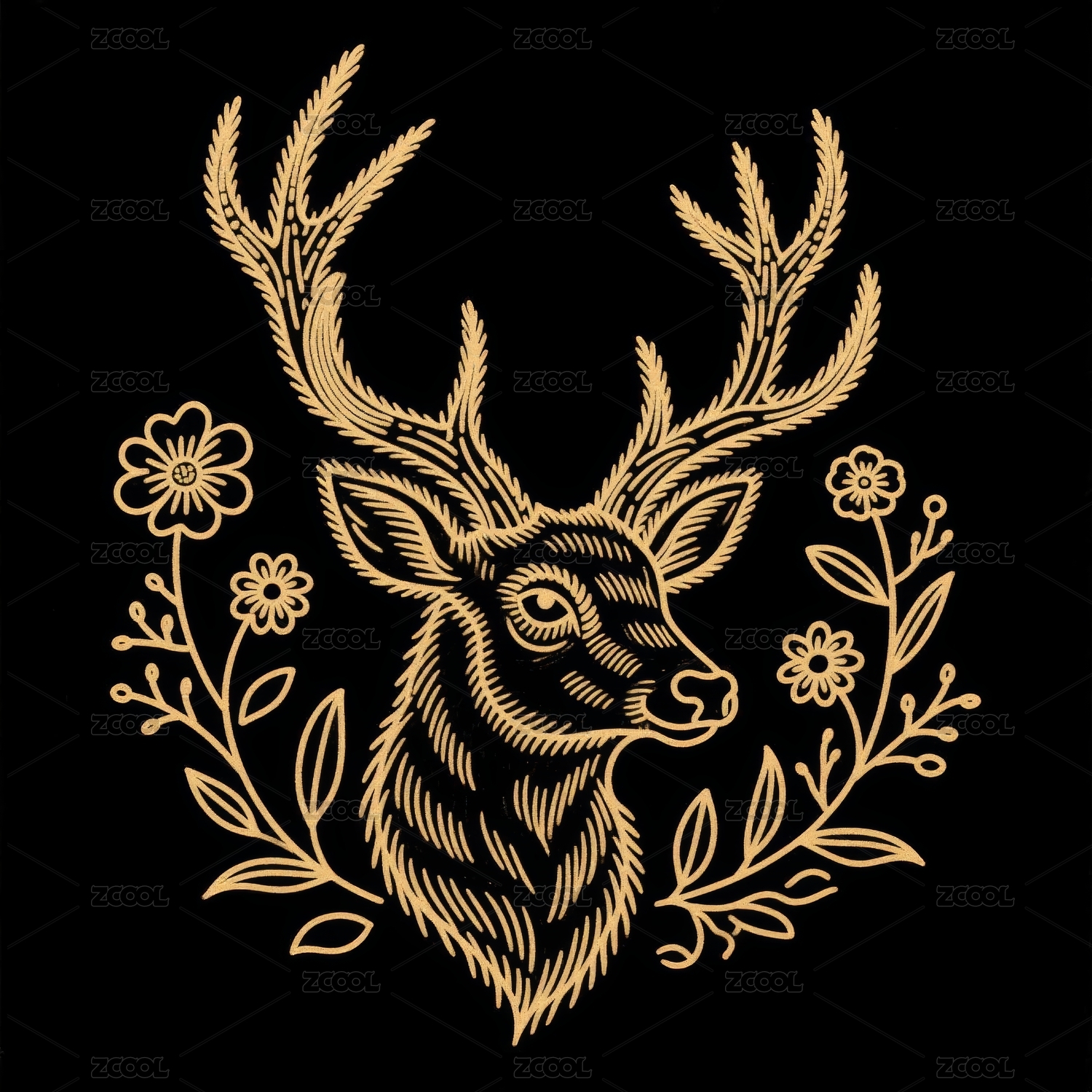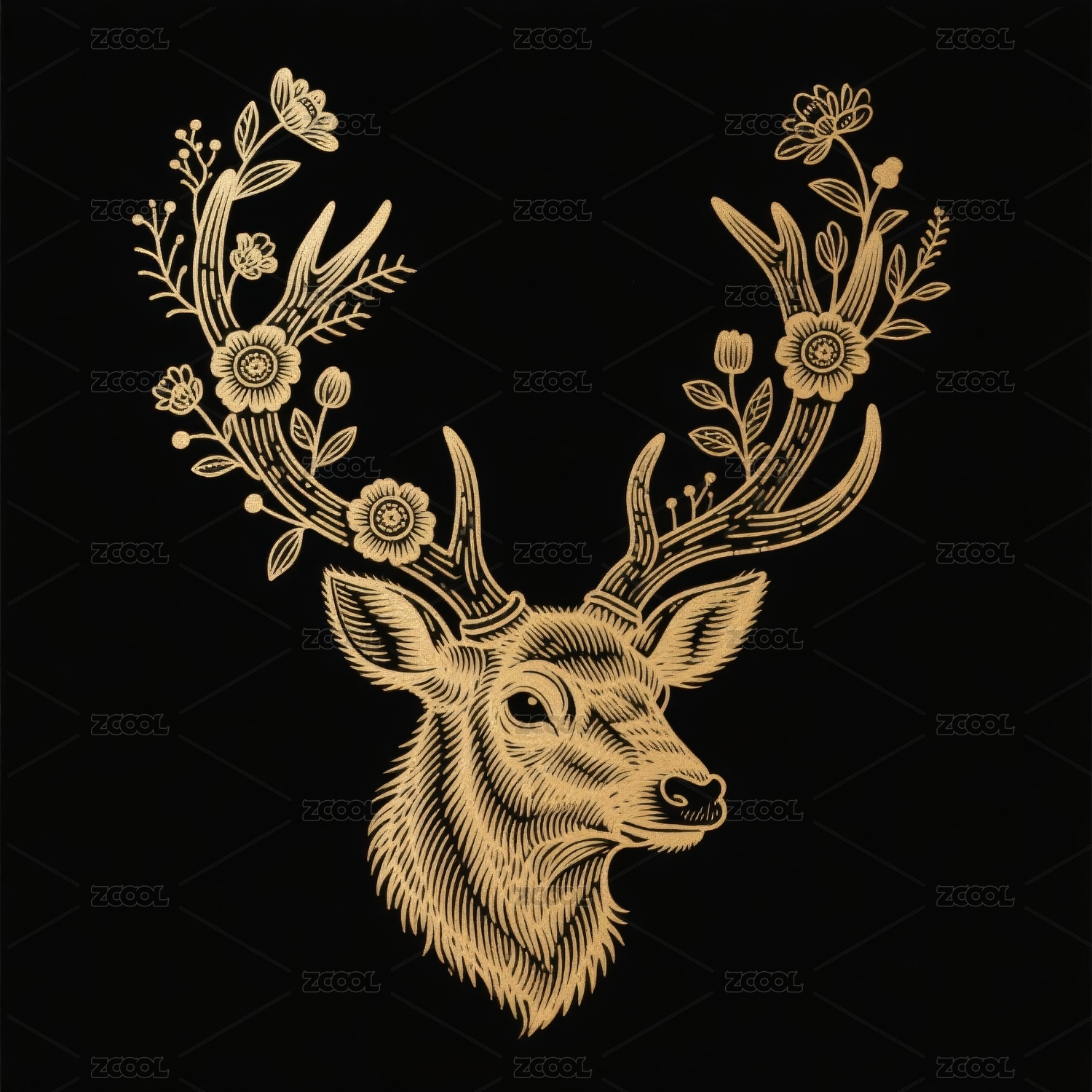 DXCZ202405,复古,黑底,双色,植物花卉,动物,装饰画,版画,鹿