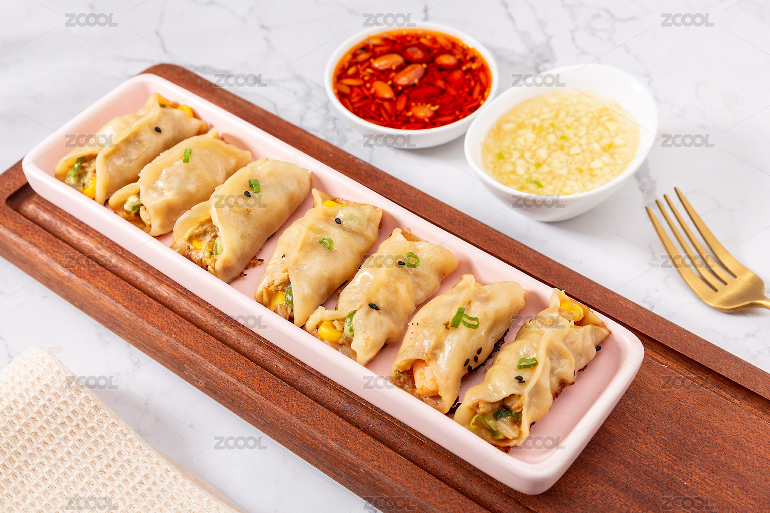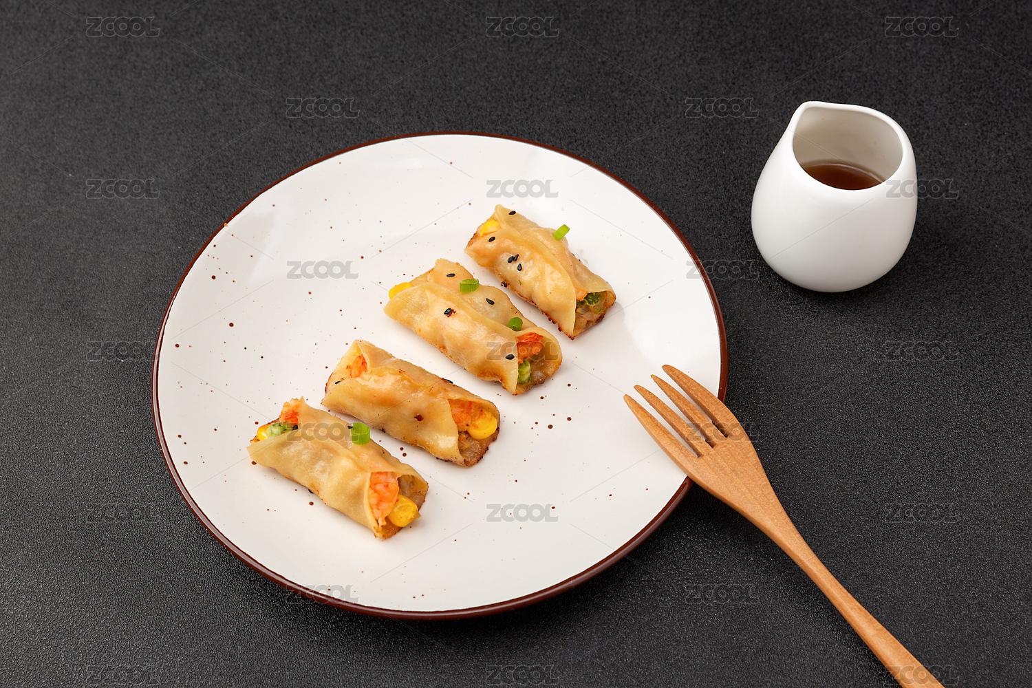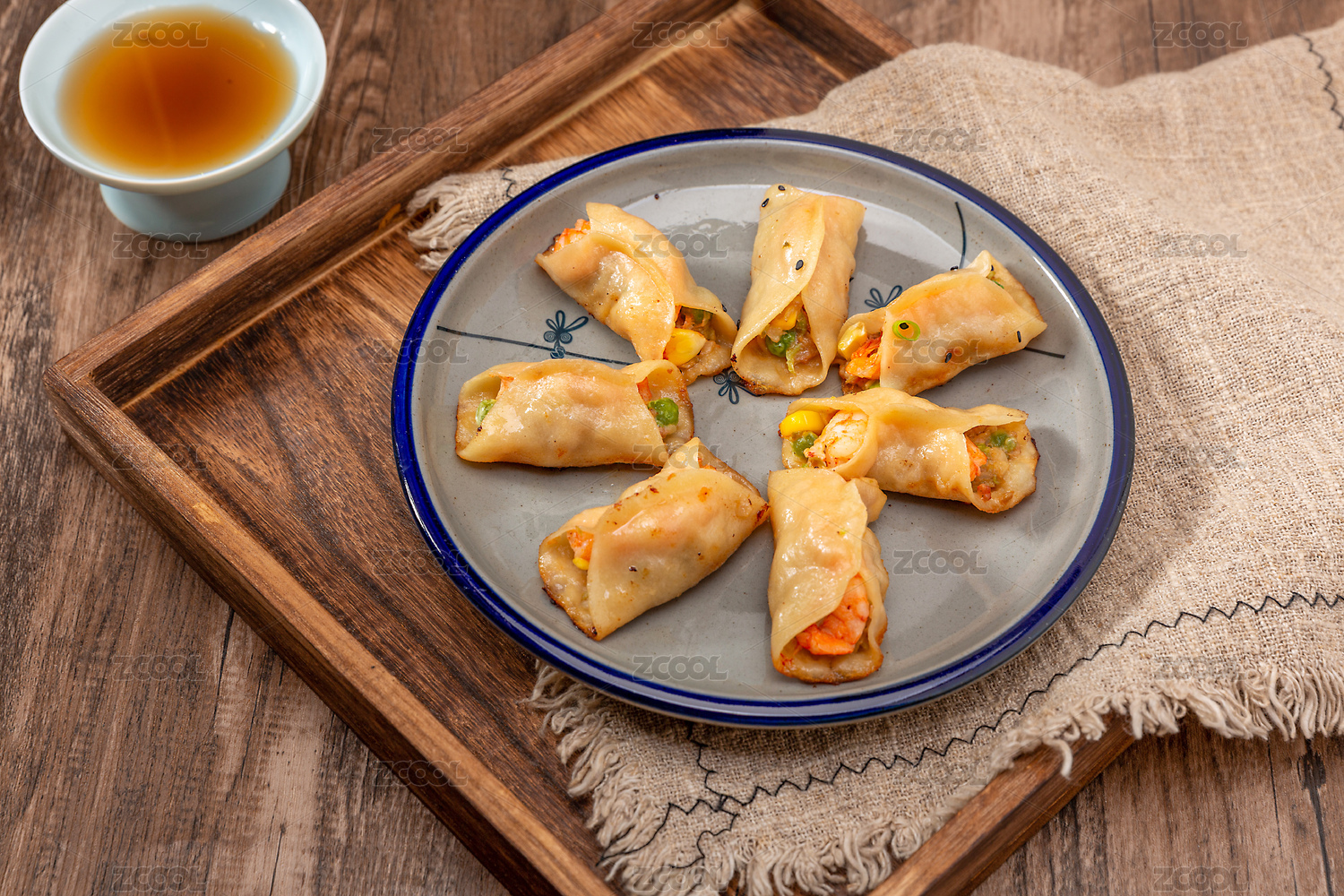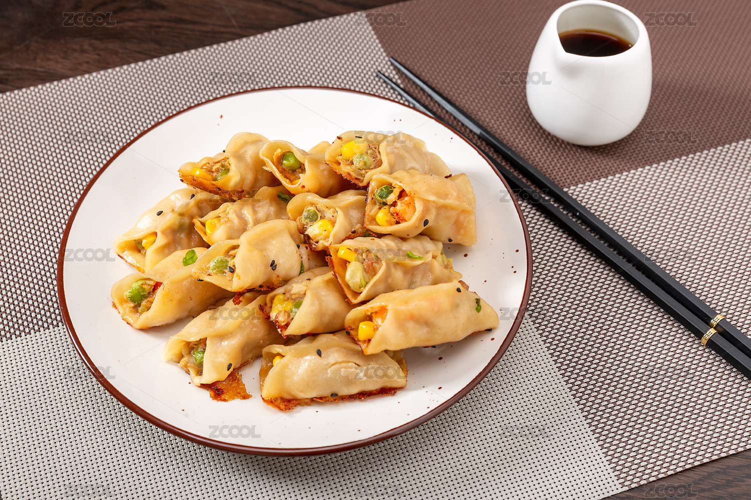 装在盘子里的玉米虾仁锅贴小吃