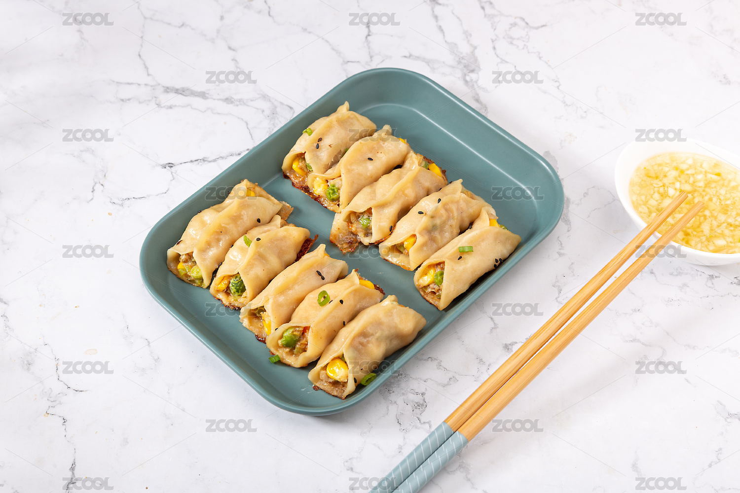 俯拍白色方盘子里的大肉锅贴