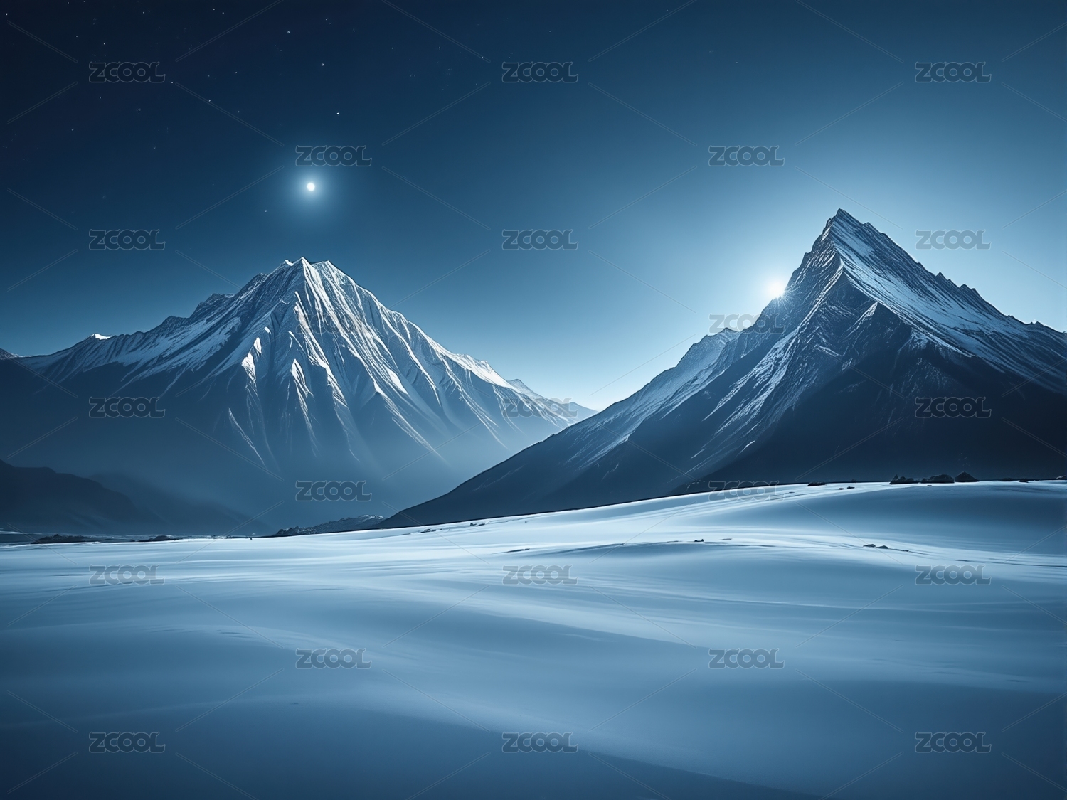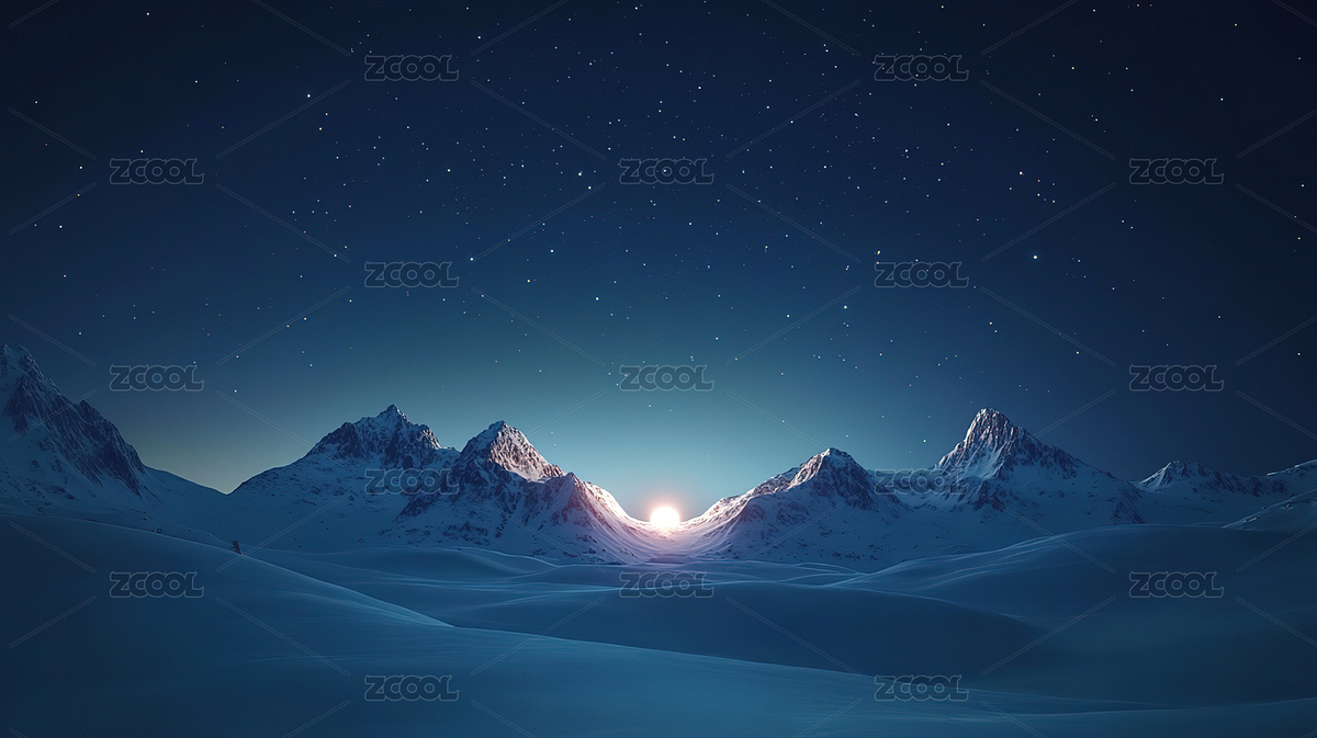 夜幕下白雪皑皑的群山景色