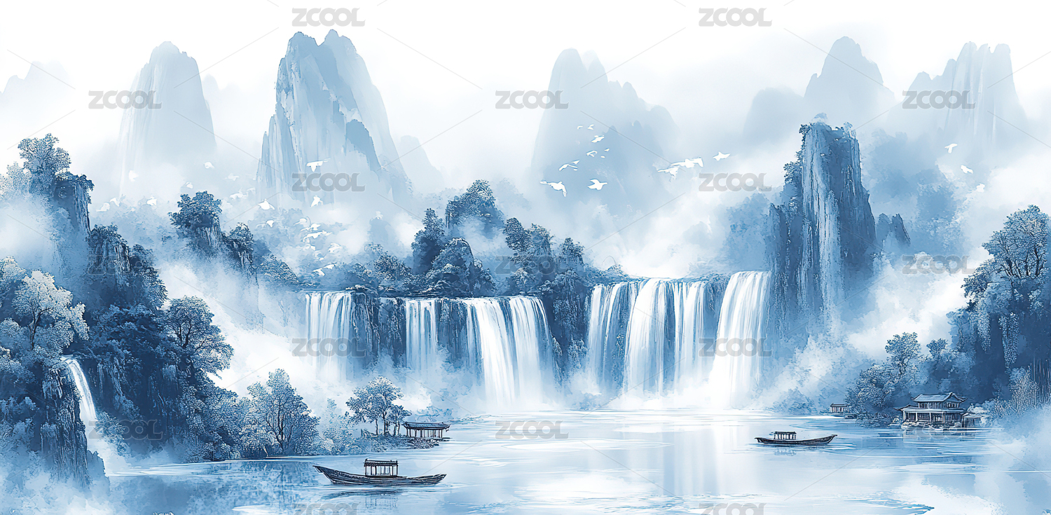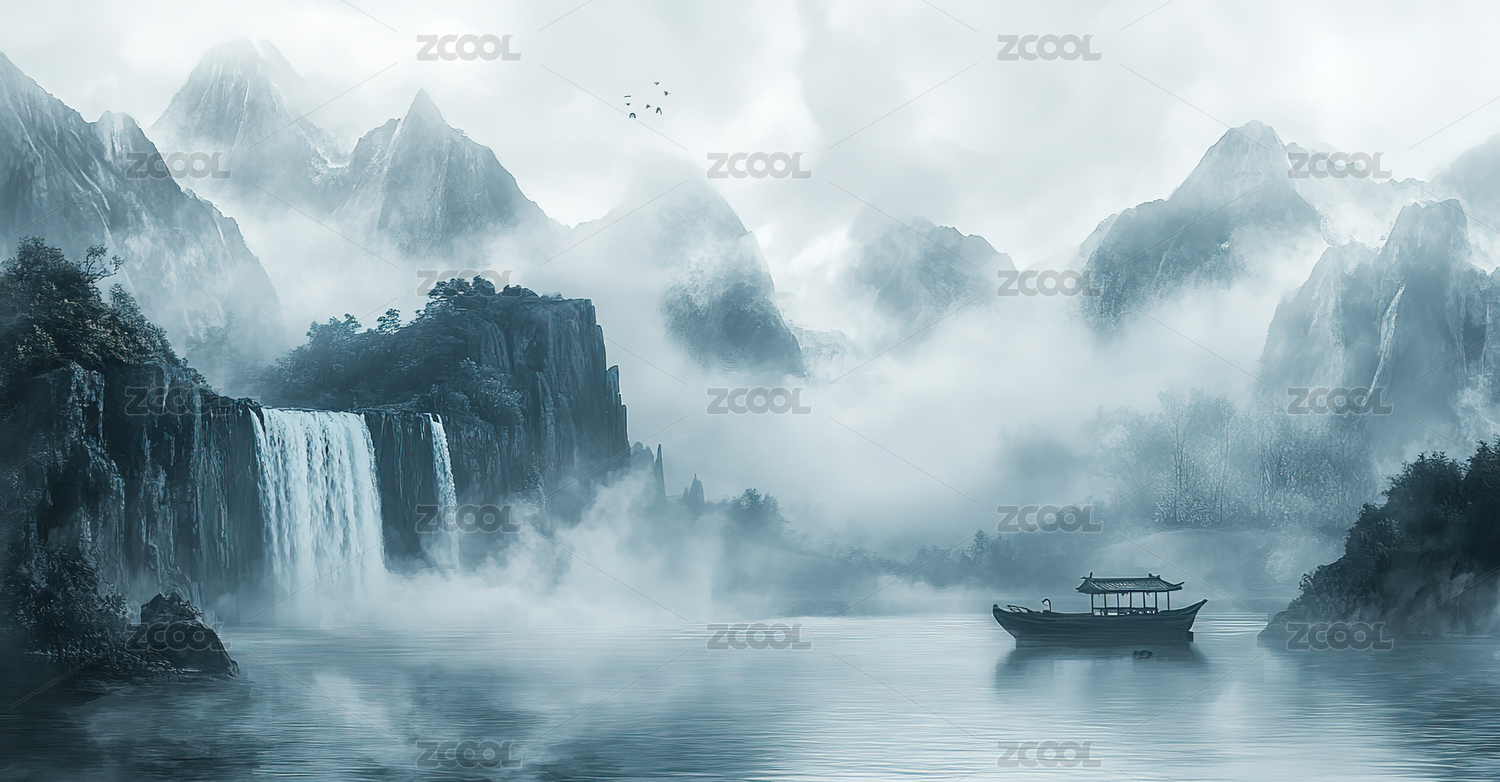 山水画卷中的古船与瀑布