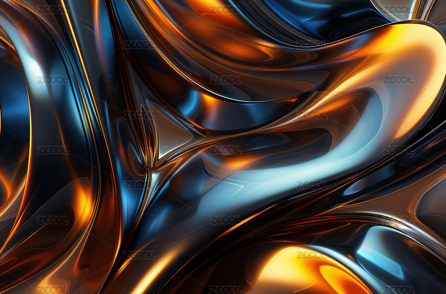 金属光泽抽象曲线流动,橙色高光渲染