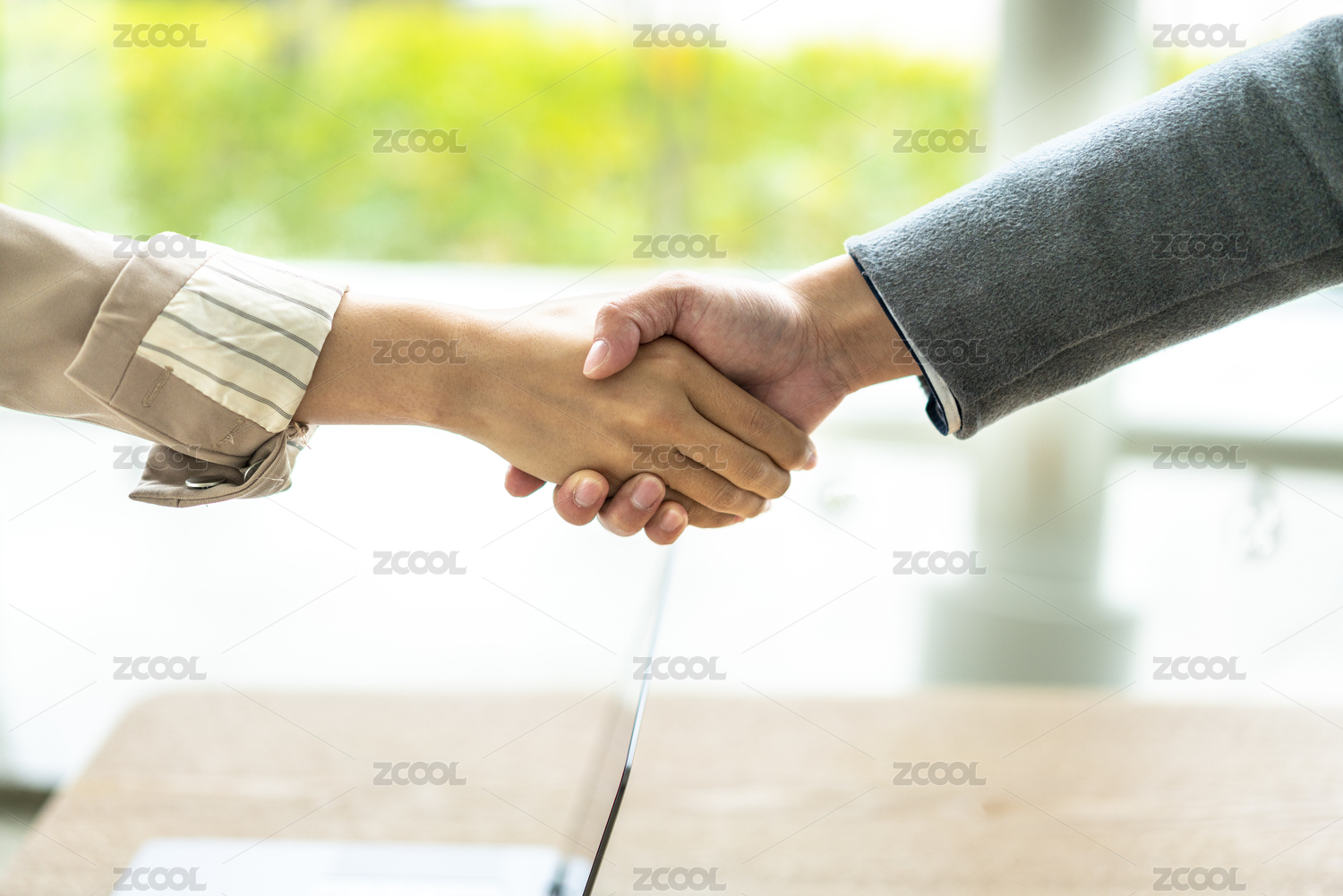 两个业务的人握手的女人在一起庆祝签署合作协议的情况下。
