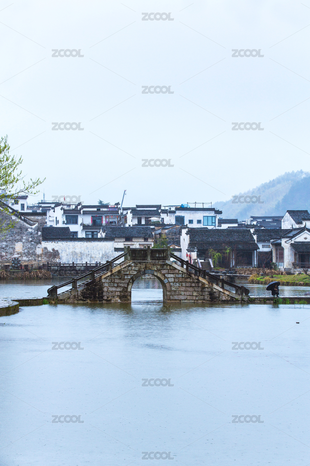 雨雾中的安徽省黄山市徽州区呈坎古镇景观