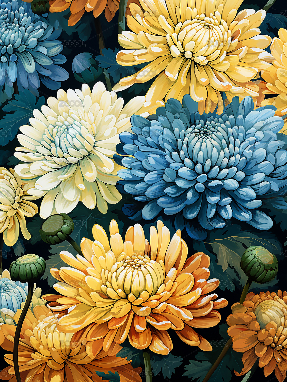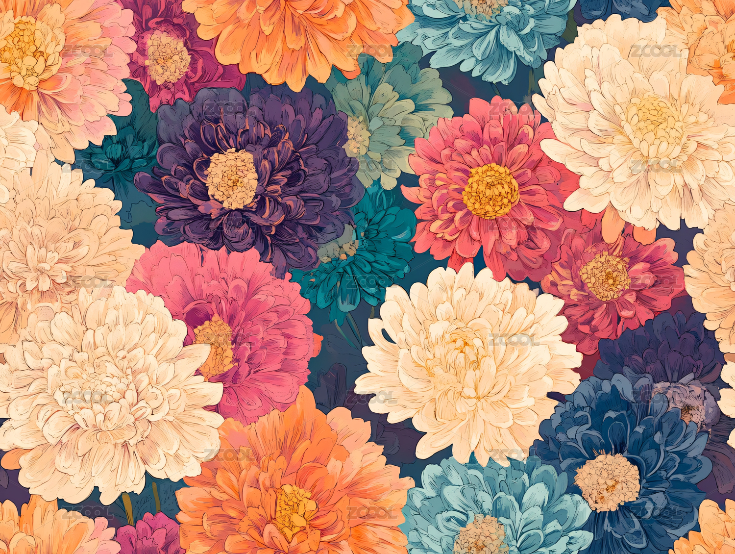 四方连续绚丽多彩的菊花印花背景