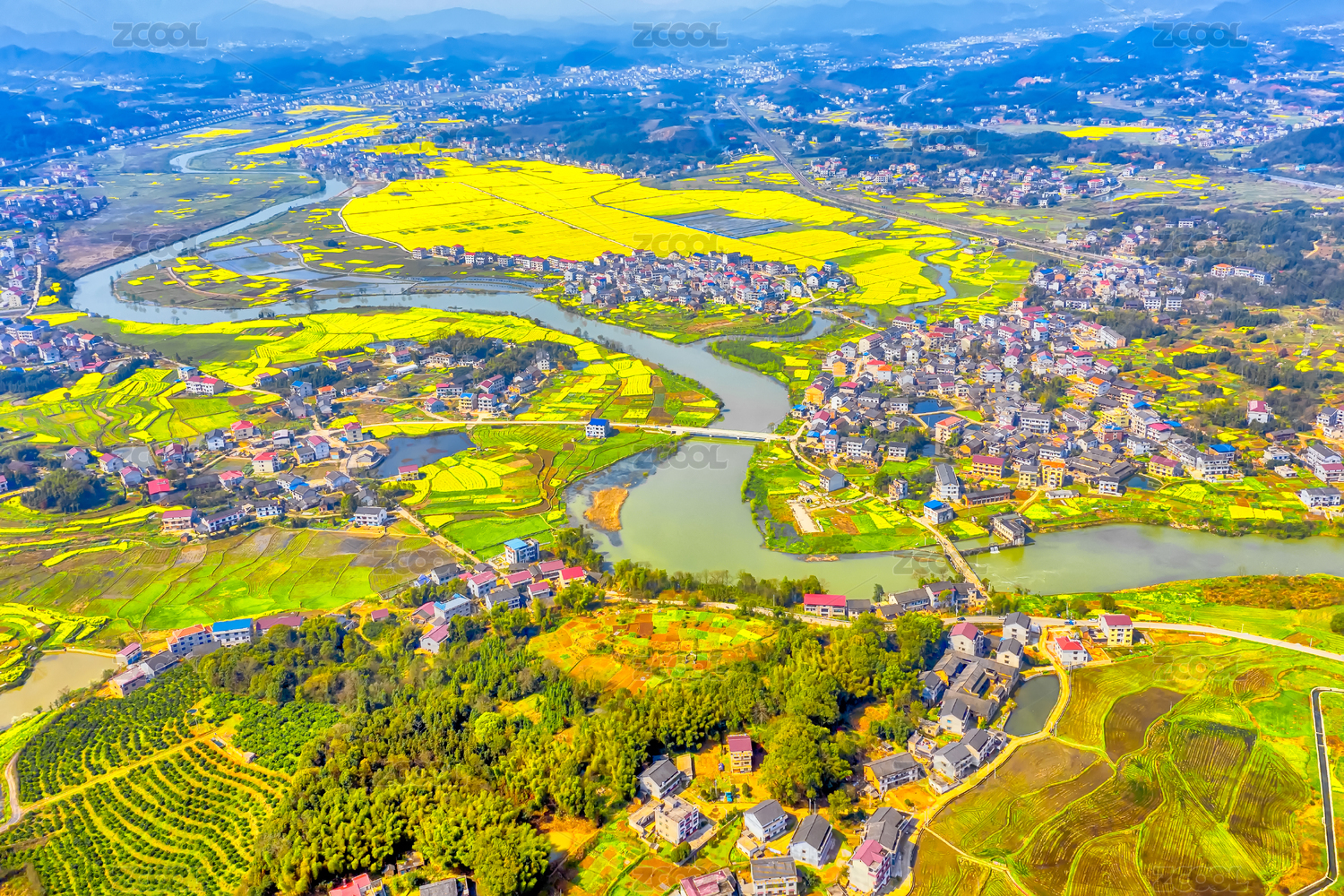 航拍春天四川德阳凯江大拐弯的油菜花田