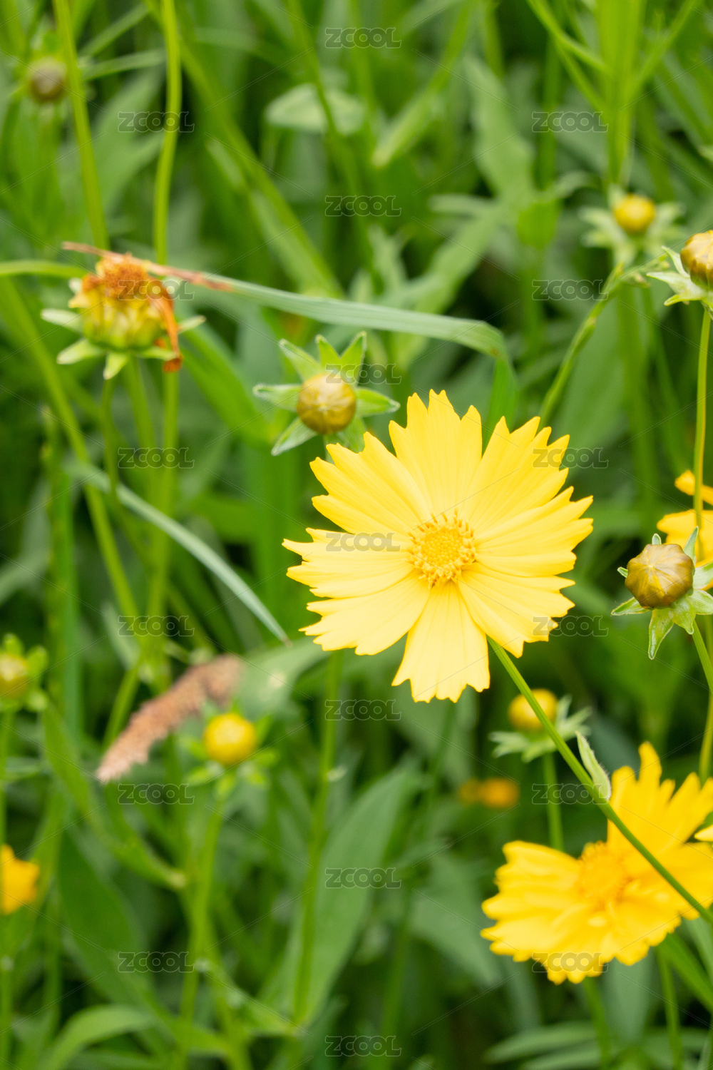 颜色艳黄,在草丛中怒放的金鸡菊