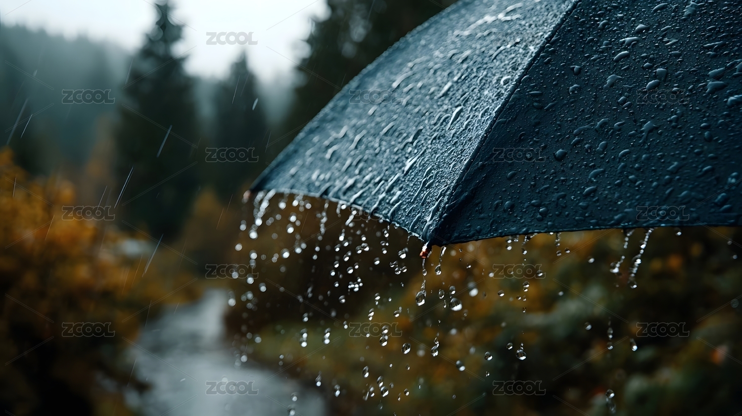 黑色雨伞上雨滴密布湿漉细节,阴暗忧郁氛围