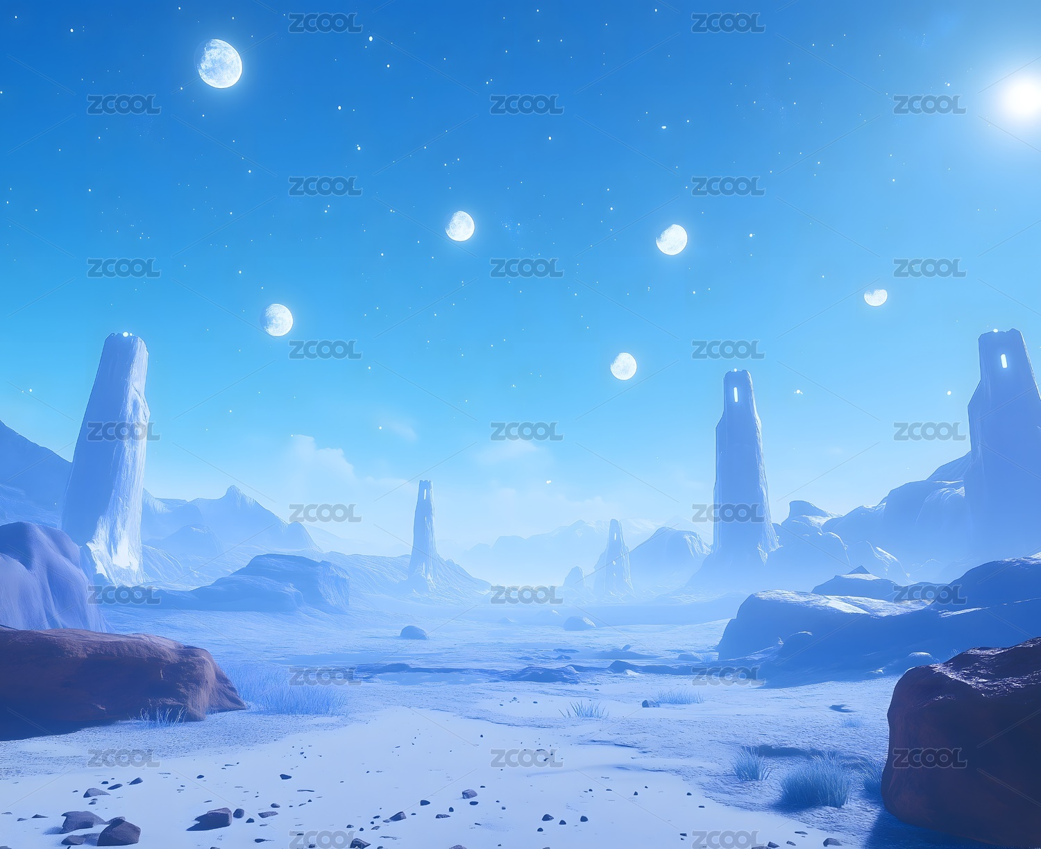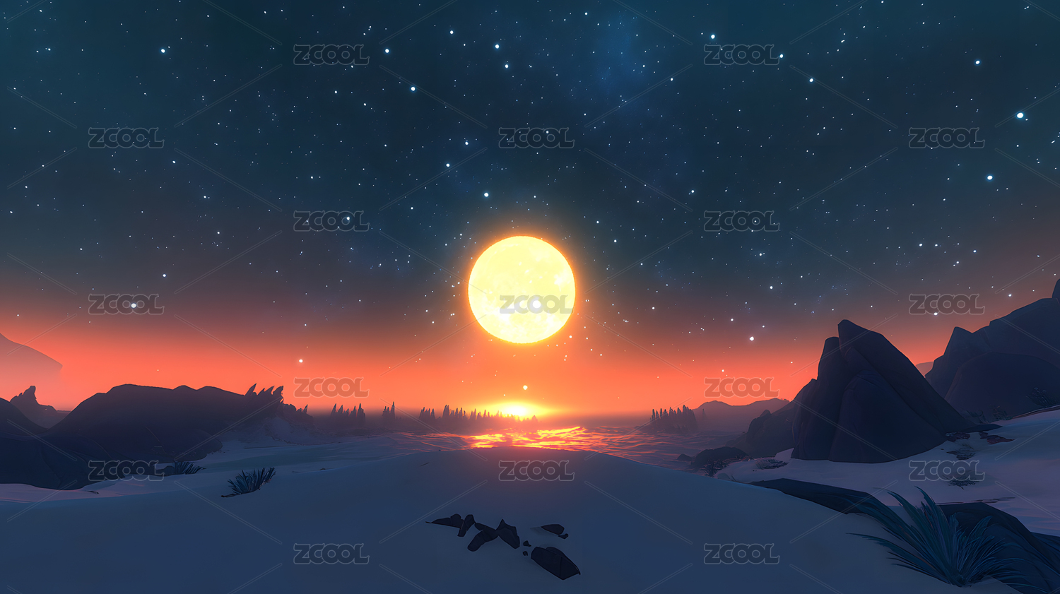 皎洁月光下低多边形 风格仰视雪山和星空的夜晚