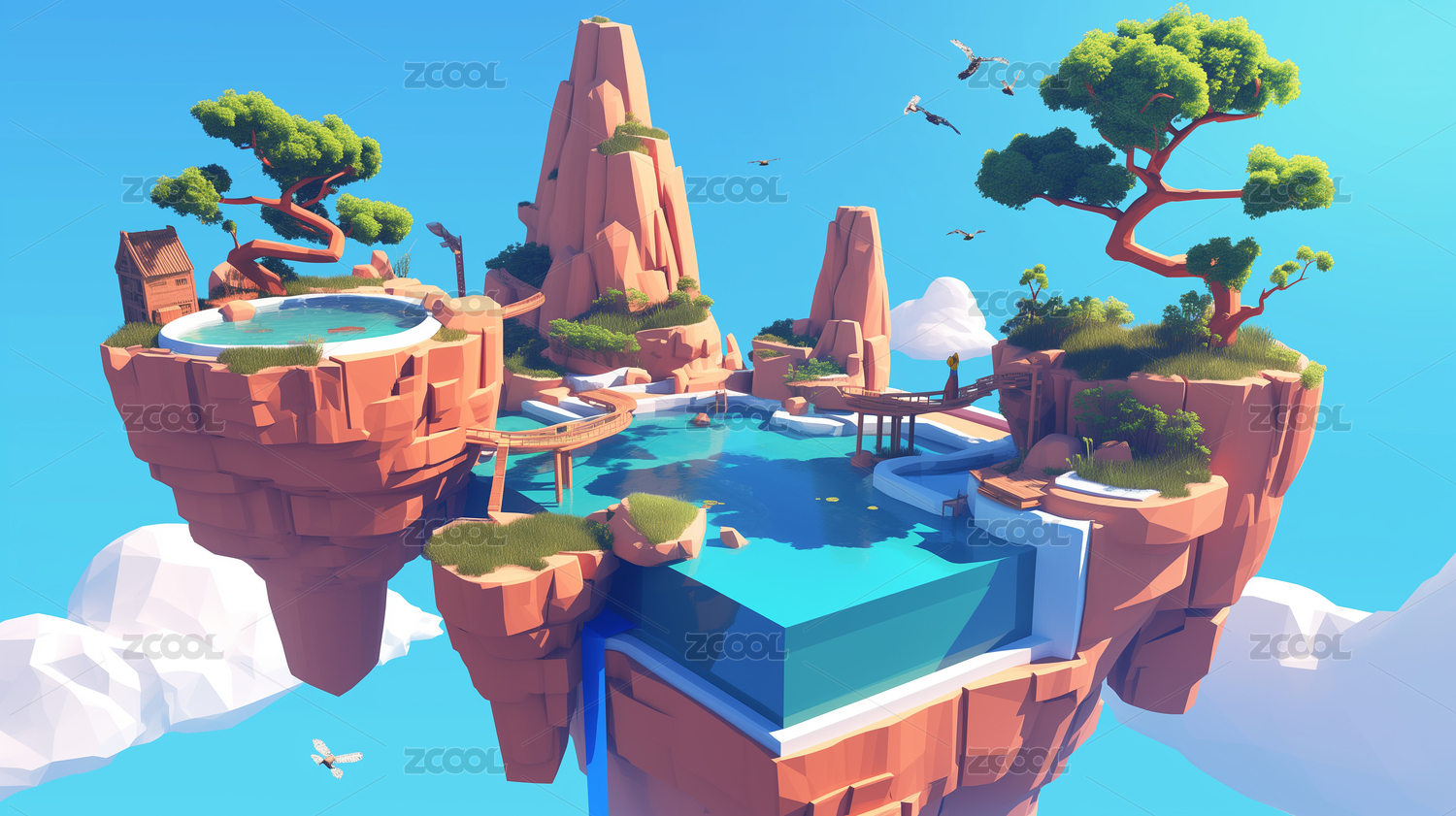 小桥流水,小岛,海岛,蓝天白云,丛林,树林,森林,低多边形,Lowpoly风格,Lowpoly