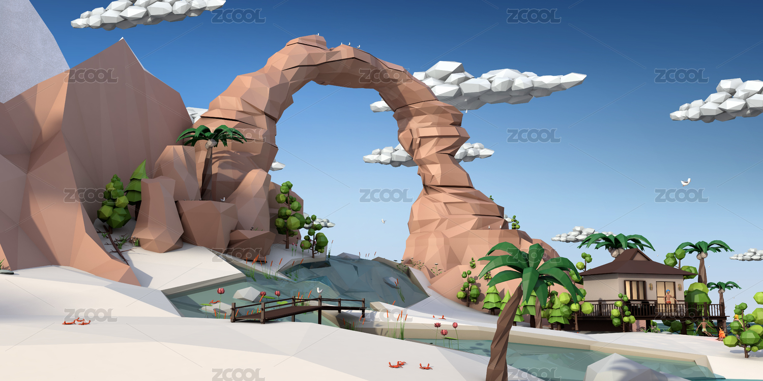 低多边形风格3D冰火度假小岛之夏日沙滩