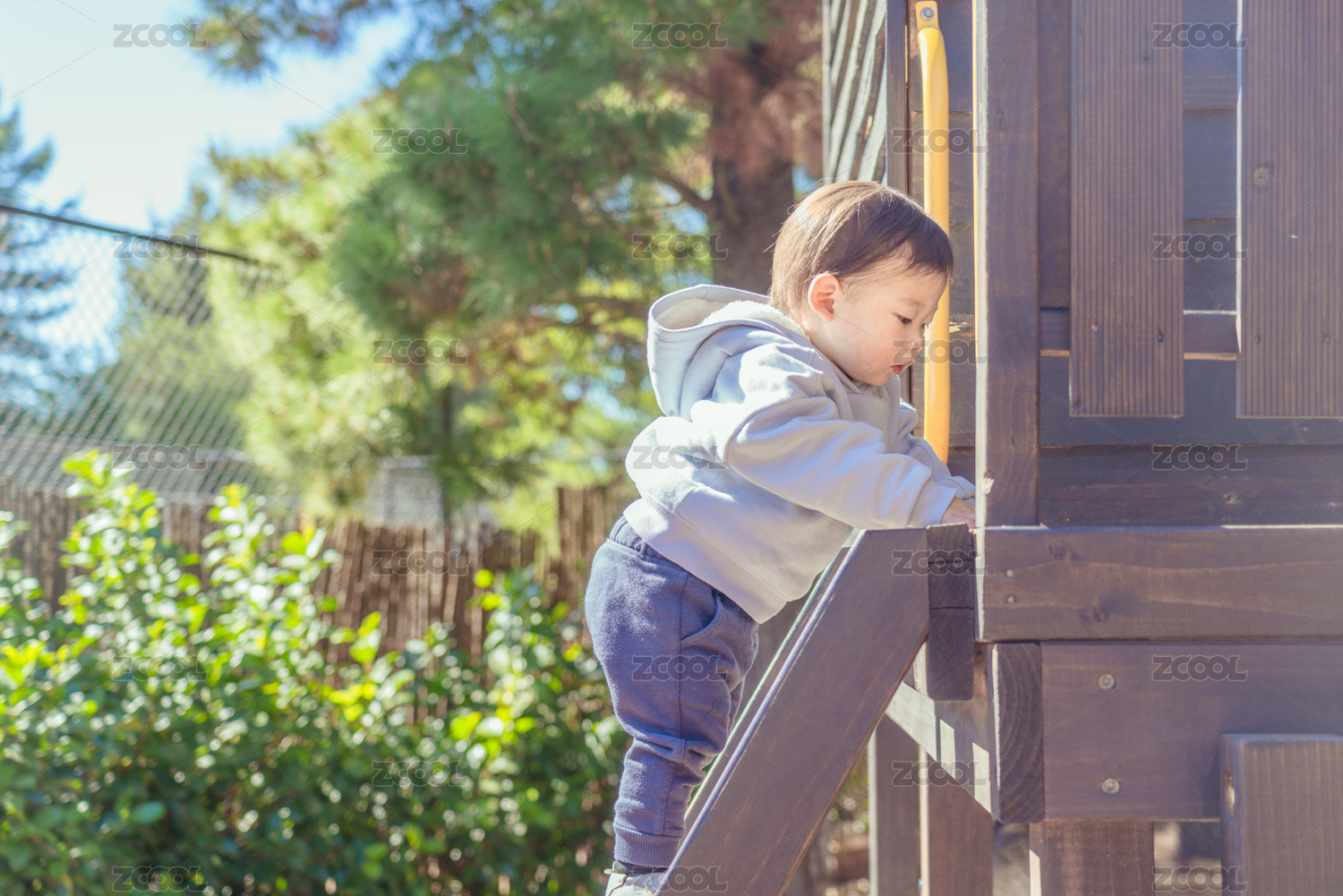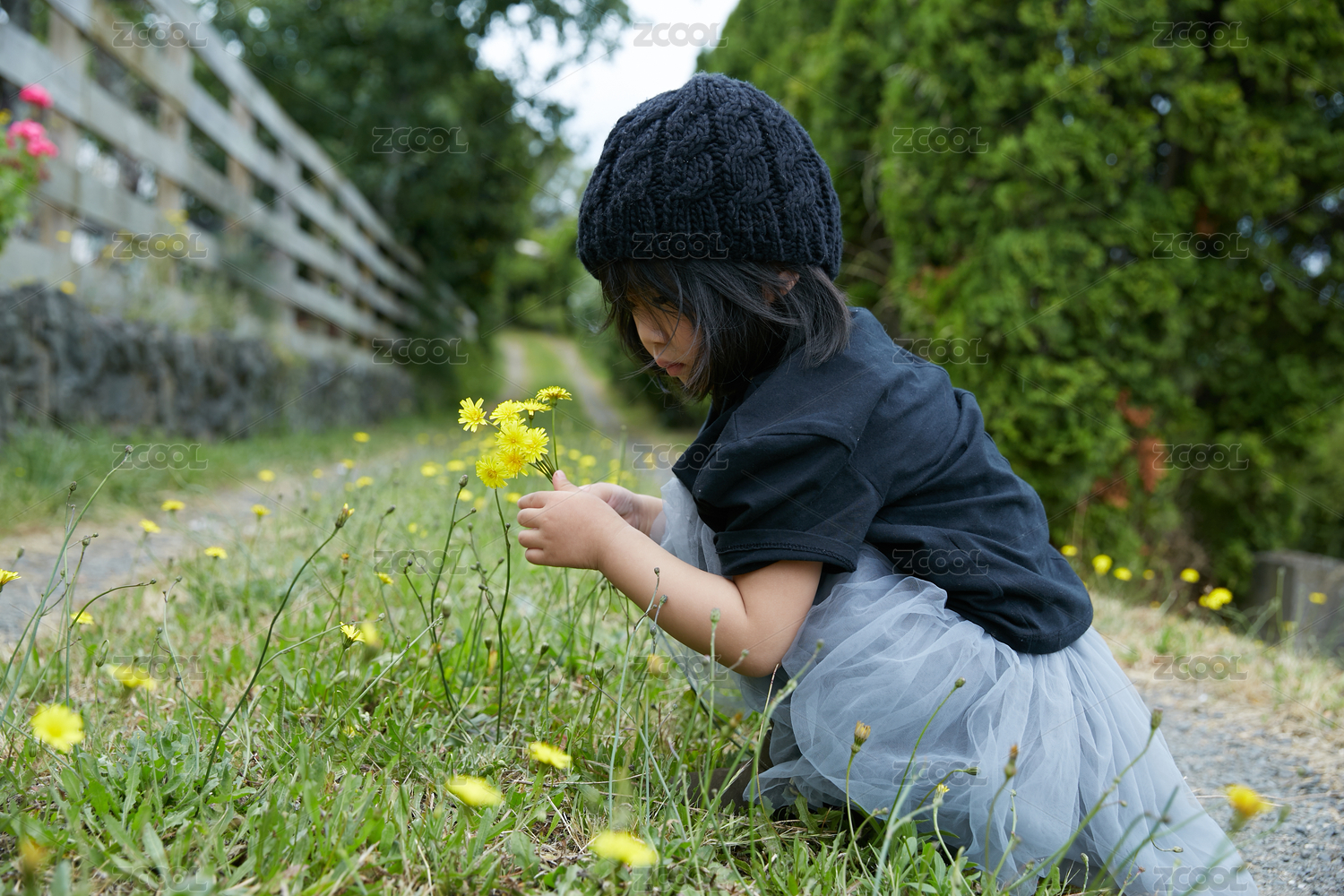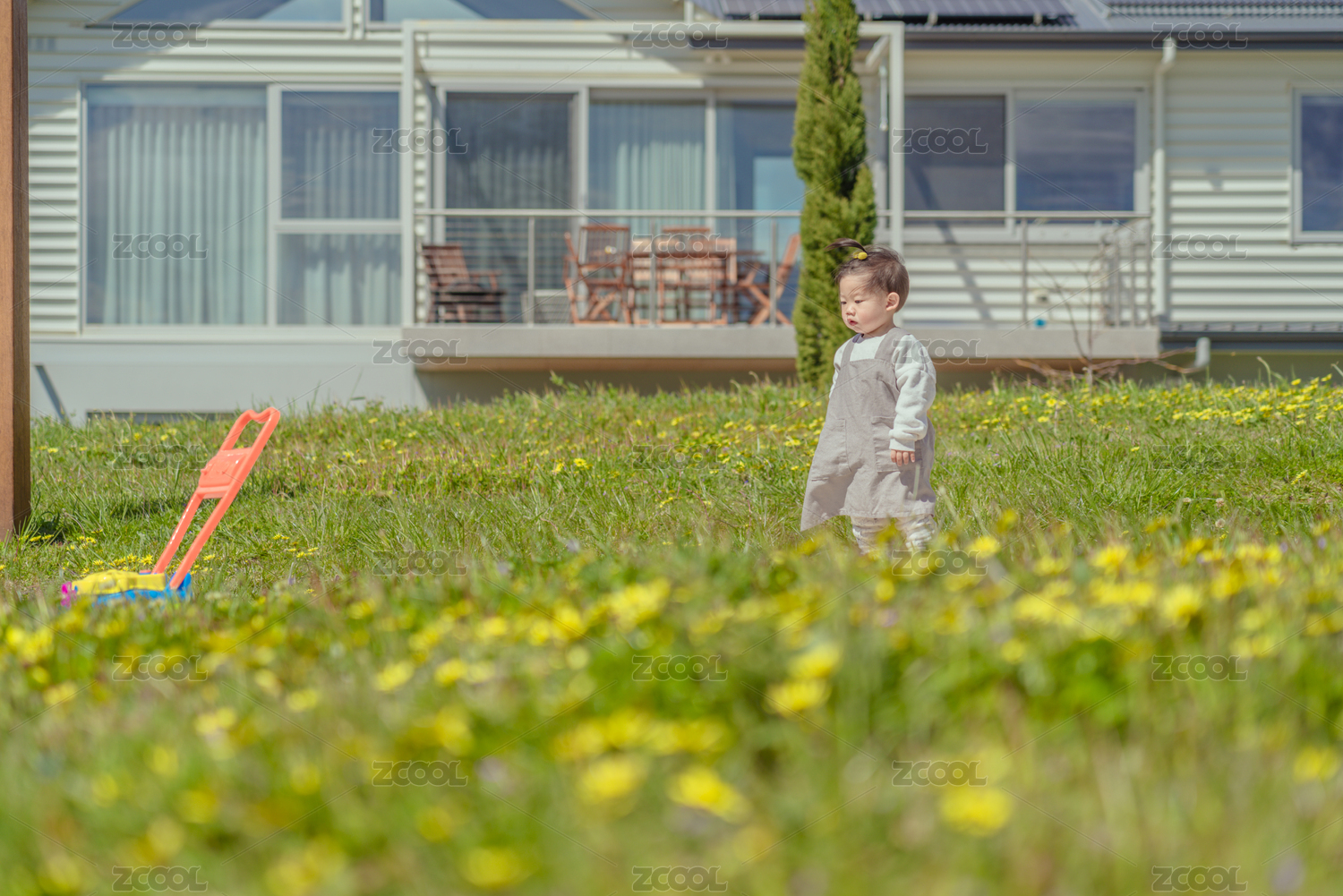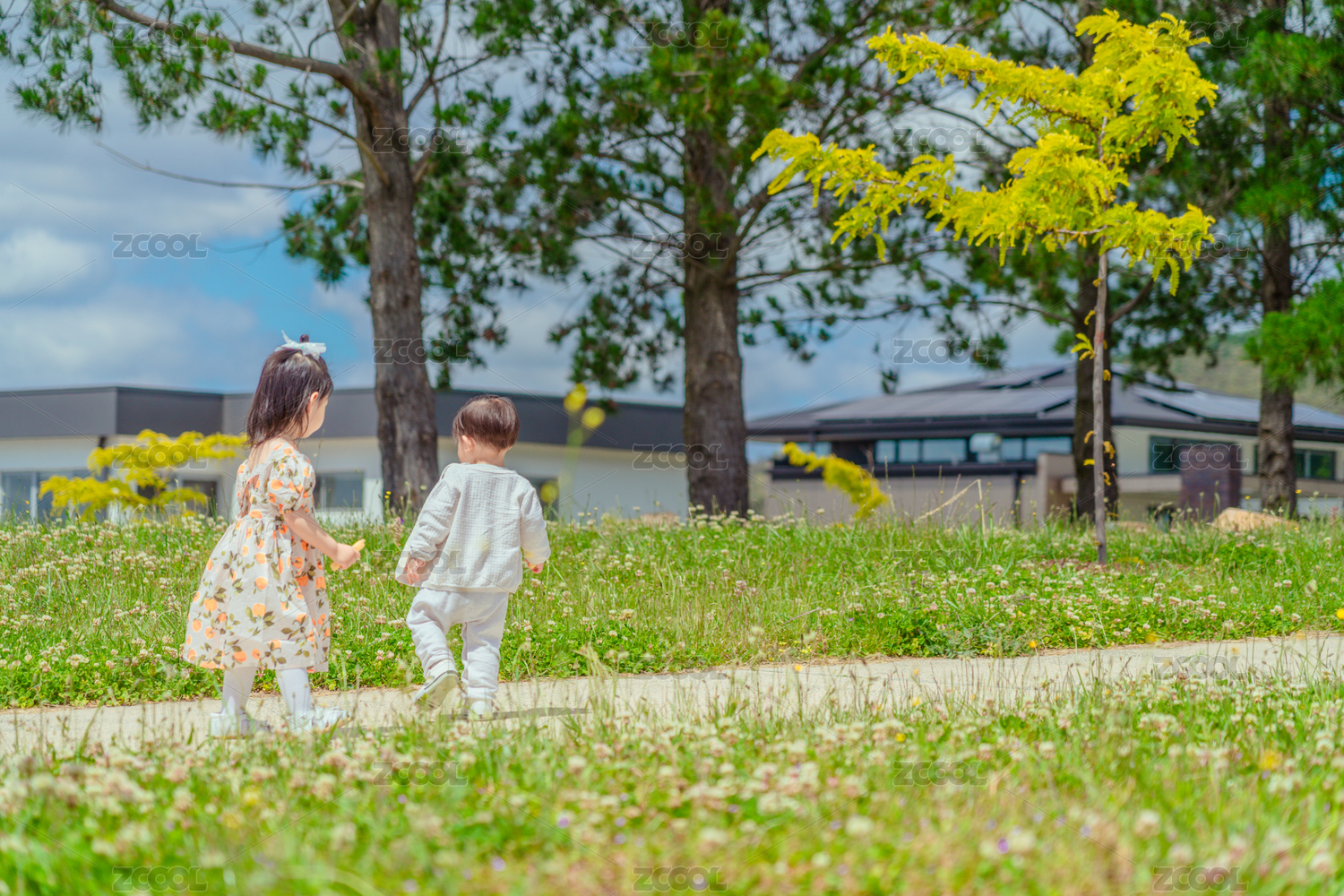妈妈陪伴草帽小男孩观赏亭子处花草