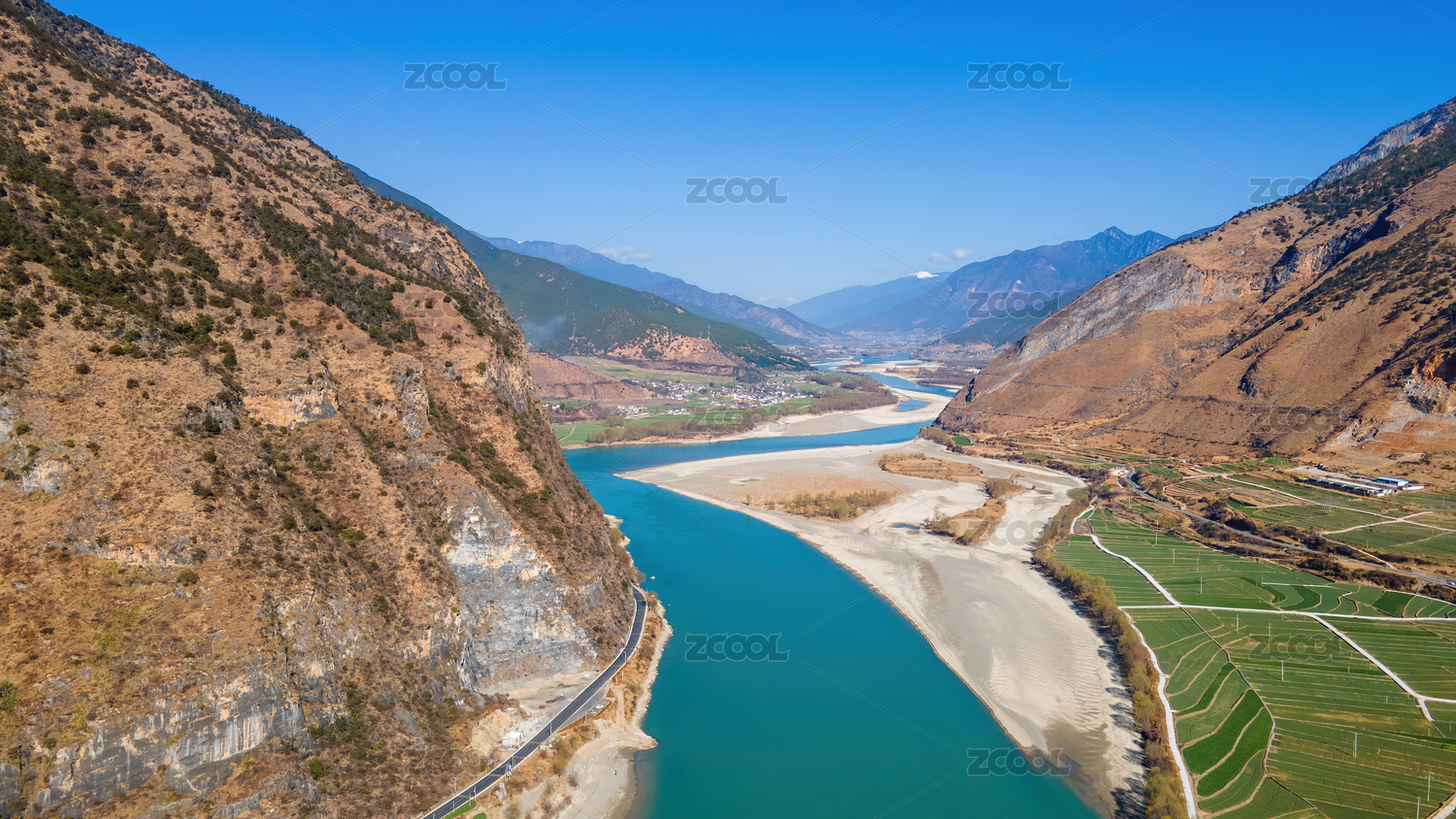 航拍中国云南丽江石鼓镇段清澈的金沙江
