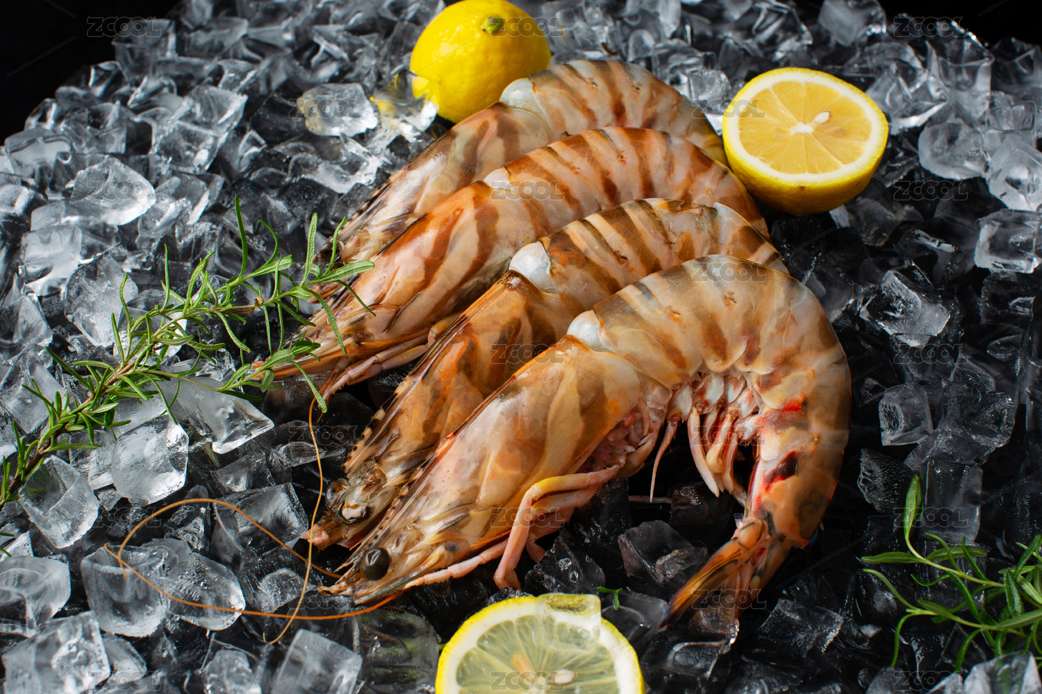黑色背景冰块上放着一些基围虾