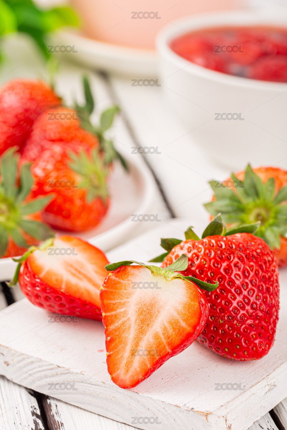 一颗切开的草莓放在满满一碟草莓碗里