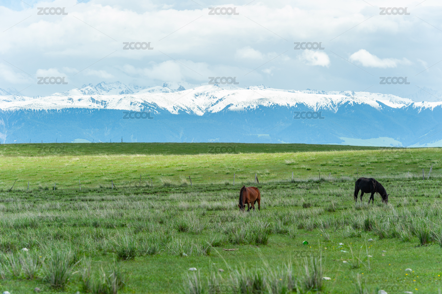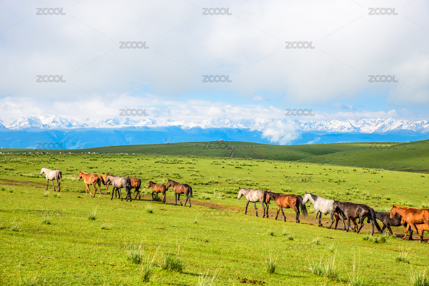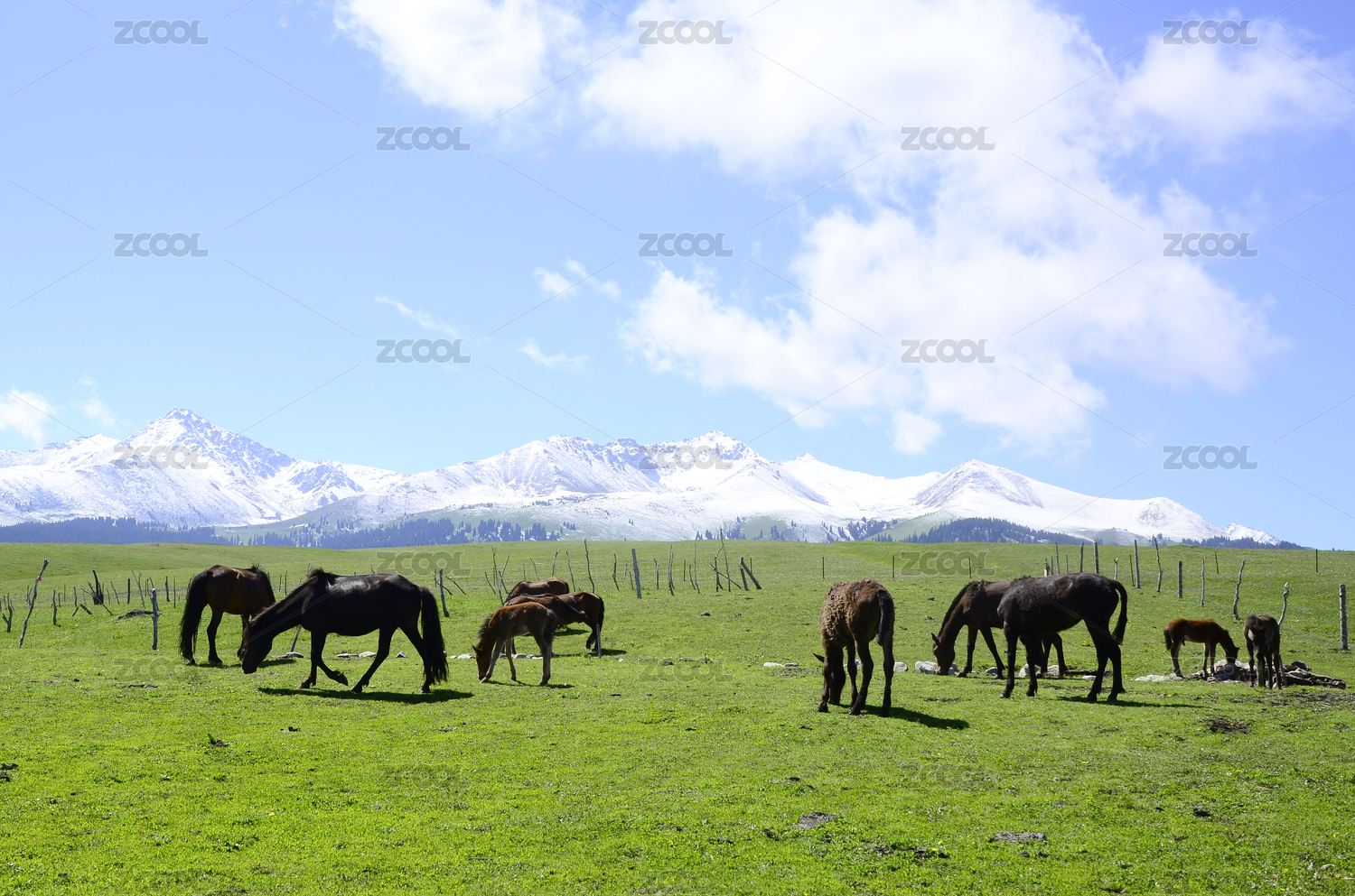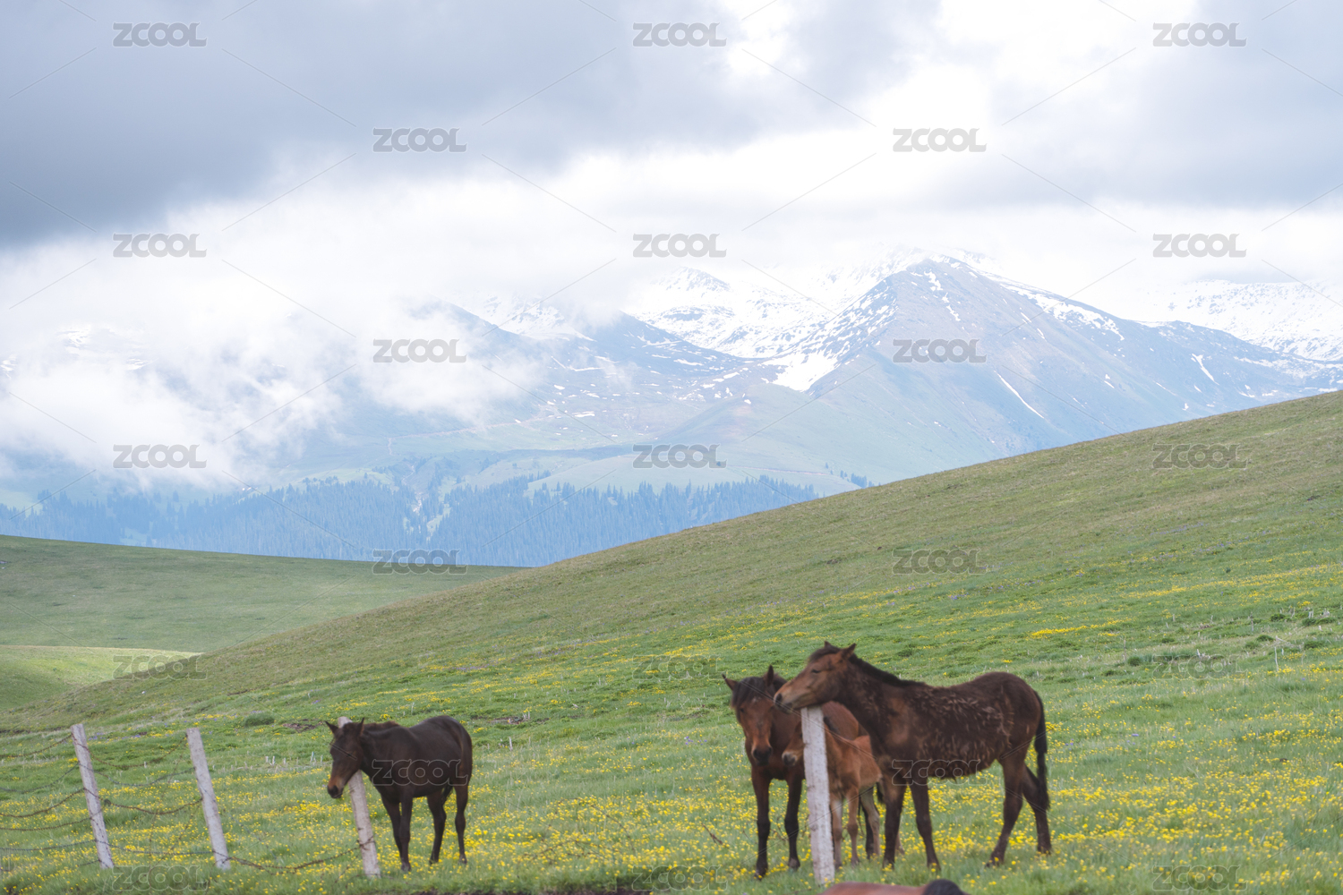 中国新疆伊犁天山脚下琼库什台草原上的牧马