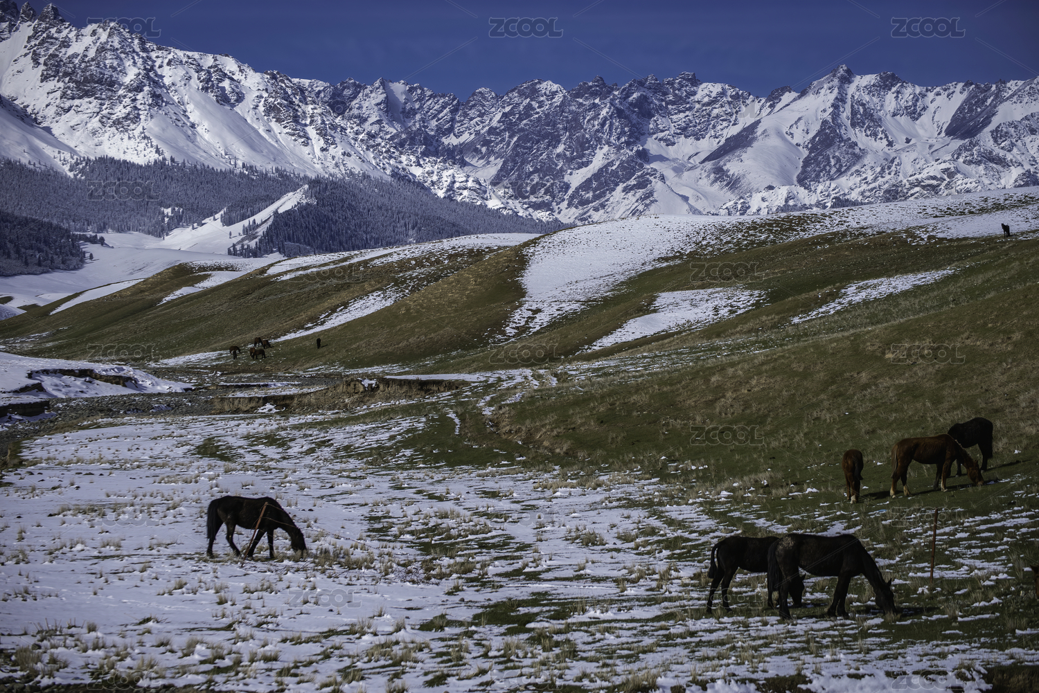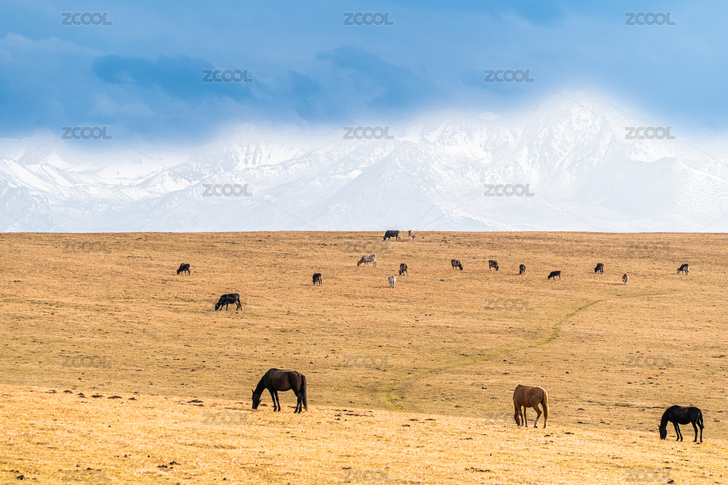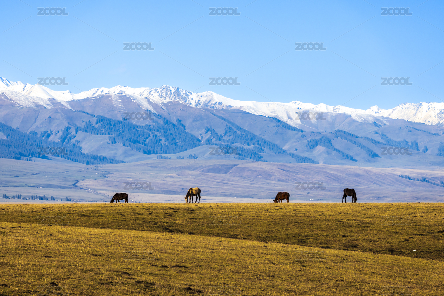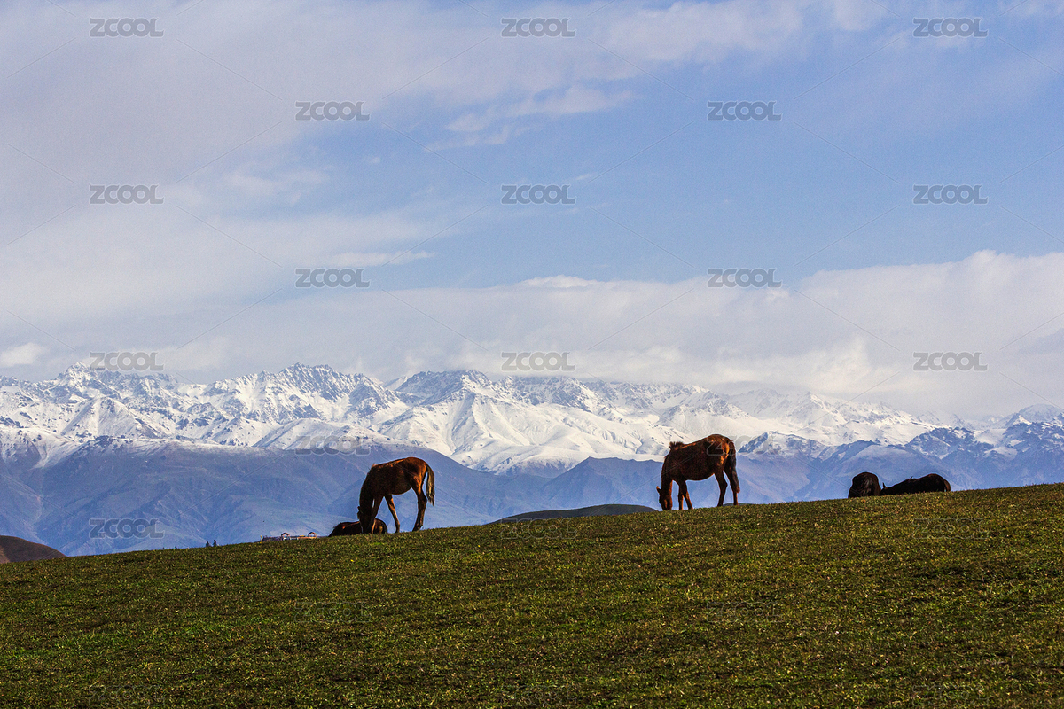 中国新疆伊犁天山脚下琼库什台草原上的牧马