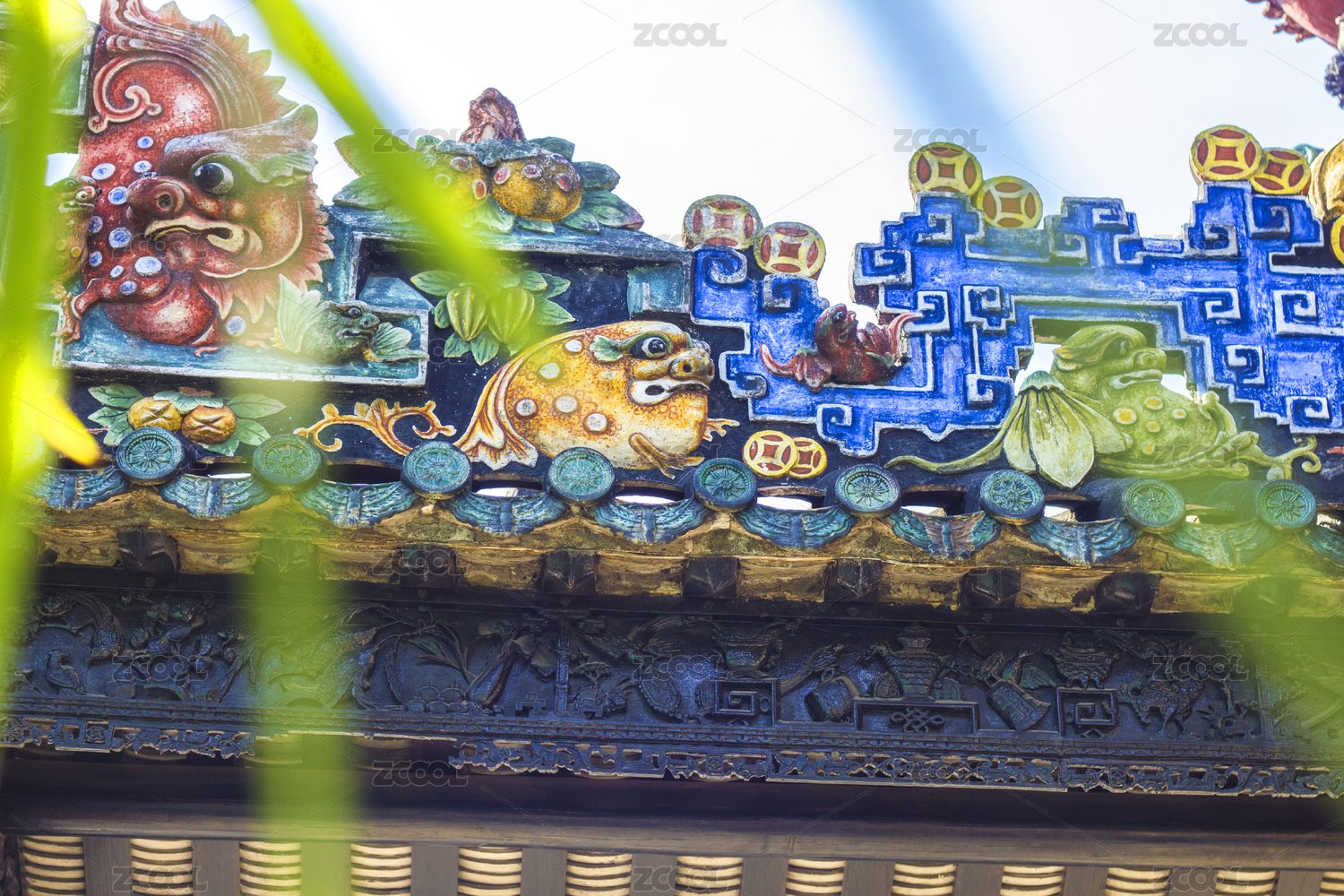 中国潮汕地区传统古建上的灰塑嵌瓷雕塑