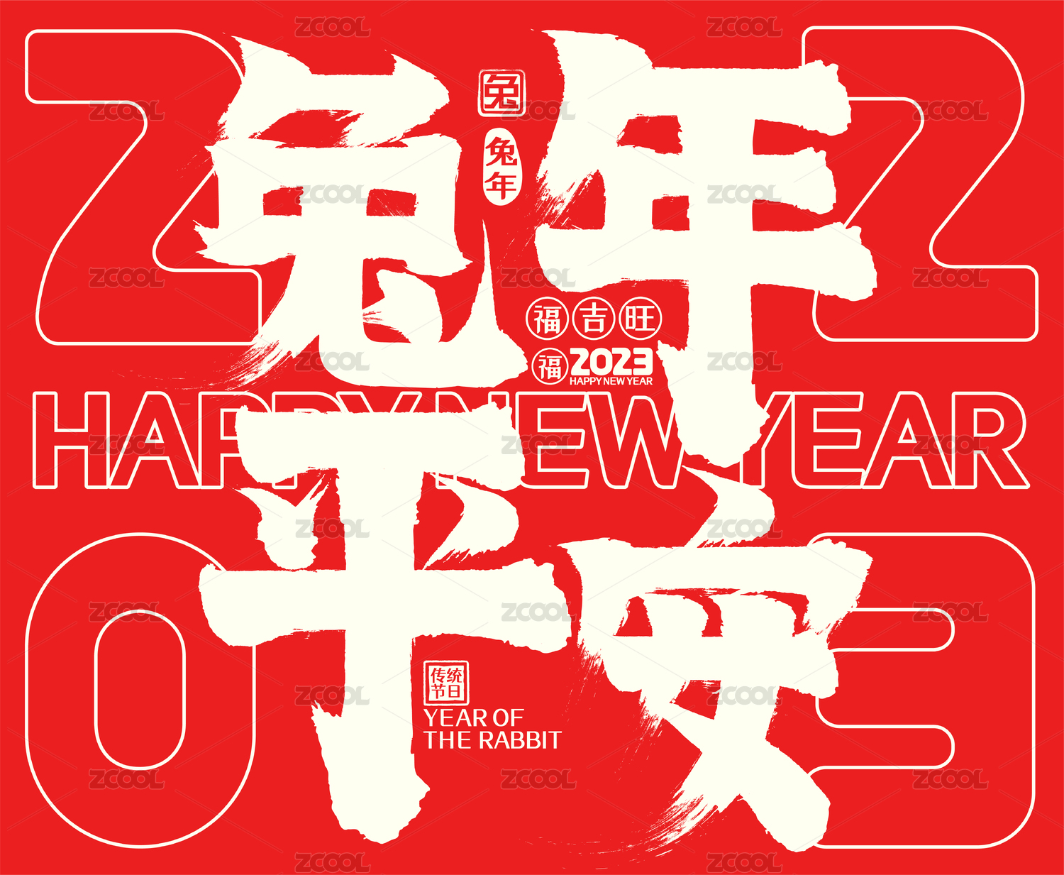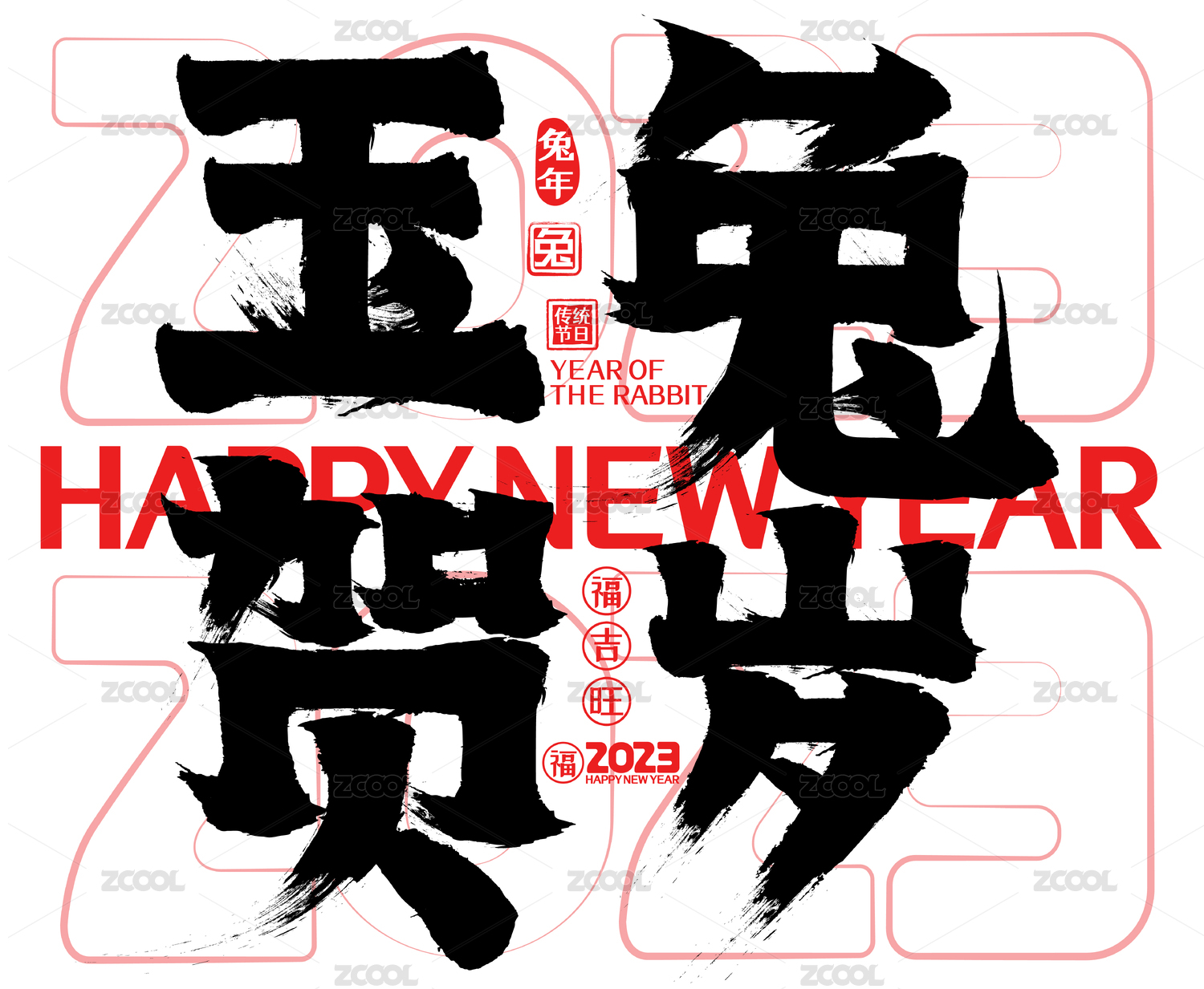 2023玉兔贺岁喜庆中国红兔年春节毛笔字