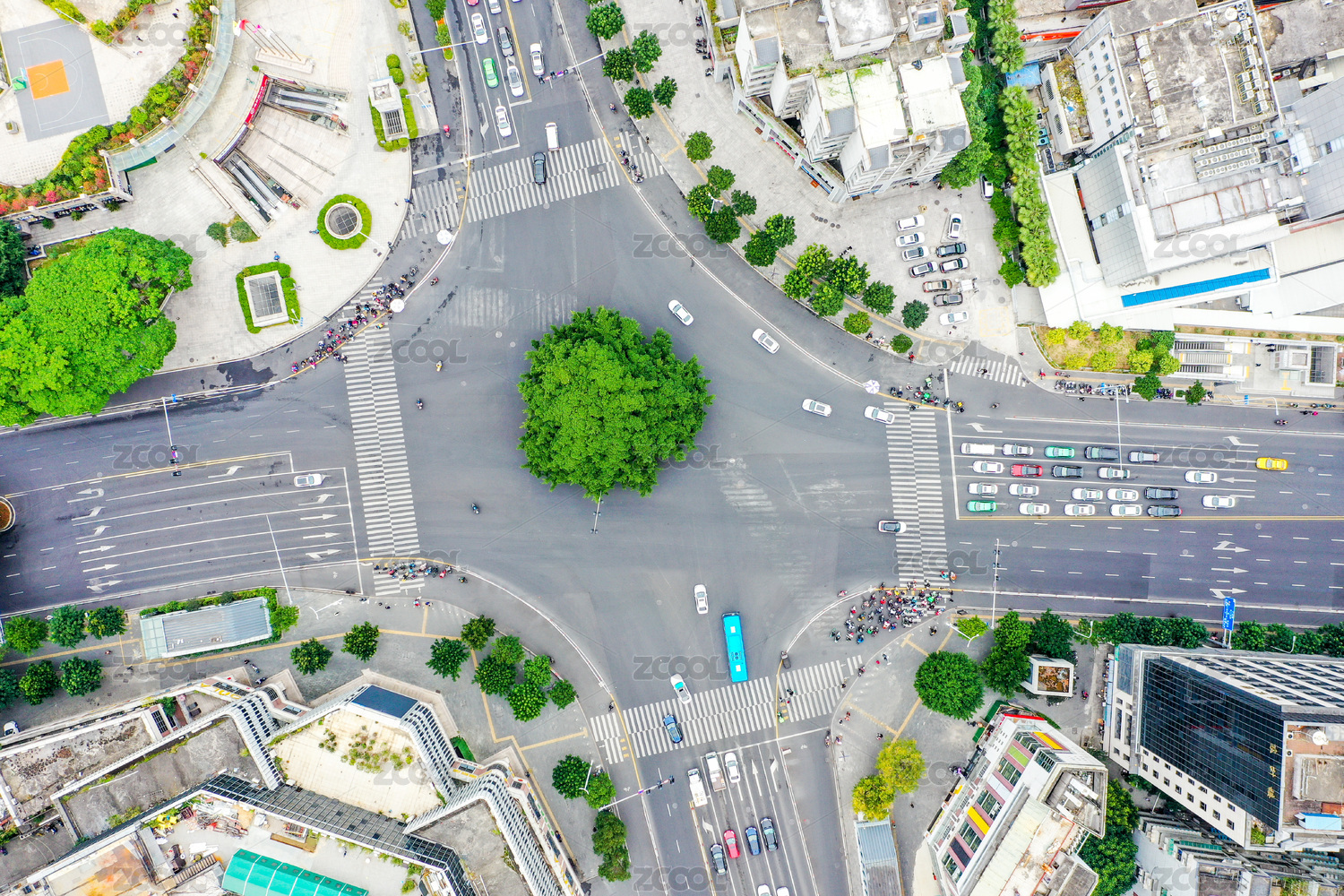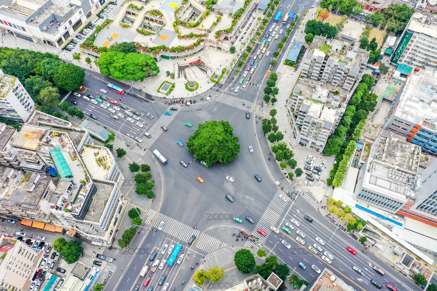 航拍中国福建福州大榕树矗立十字路口道路正中间