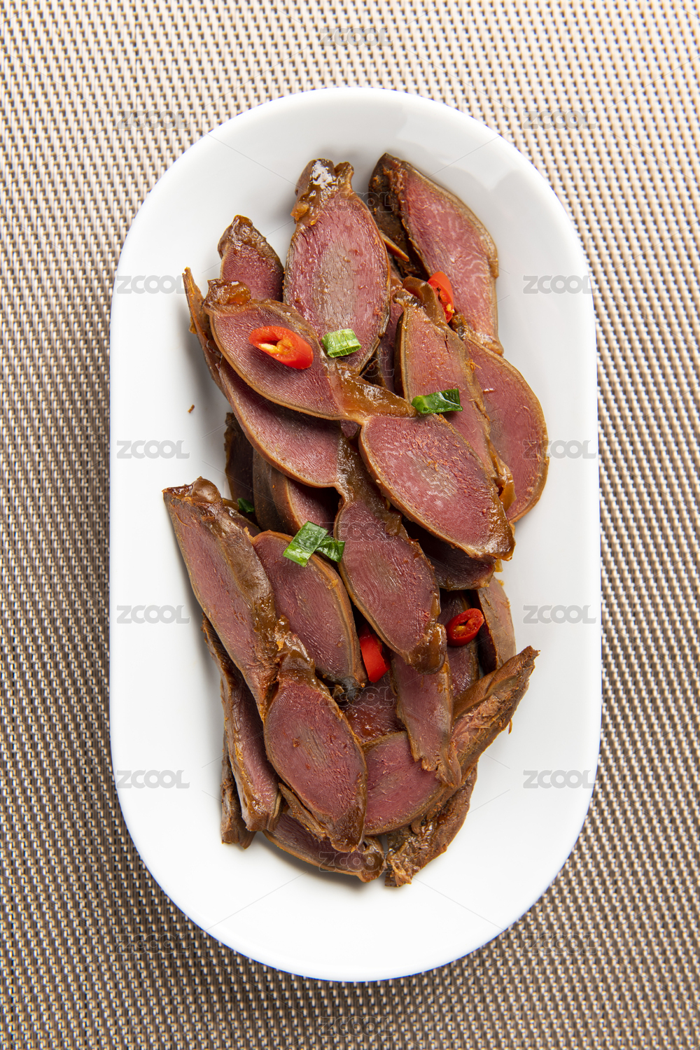 一盘卤鸭胗摆放在桌面上特写