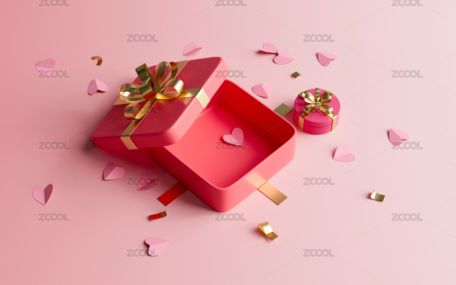 浪漫粉红色礼盒与金色蝴蝶结点缀的心形装饰