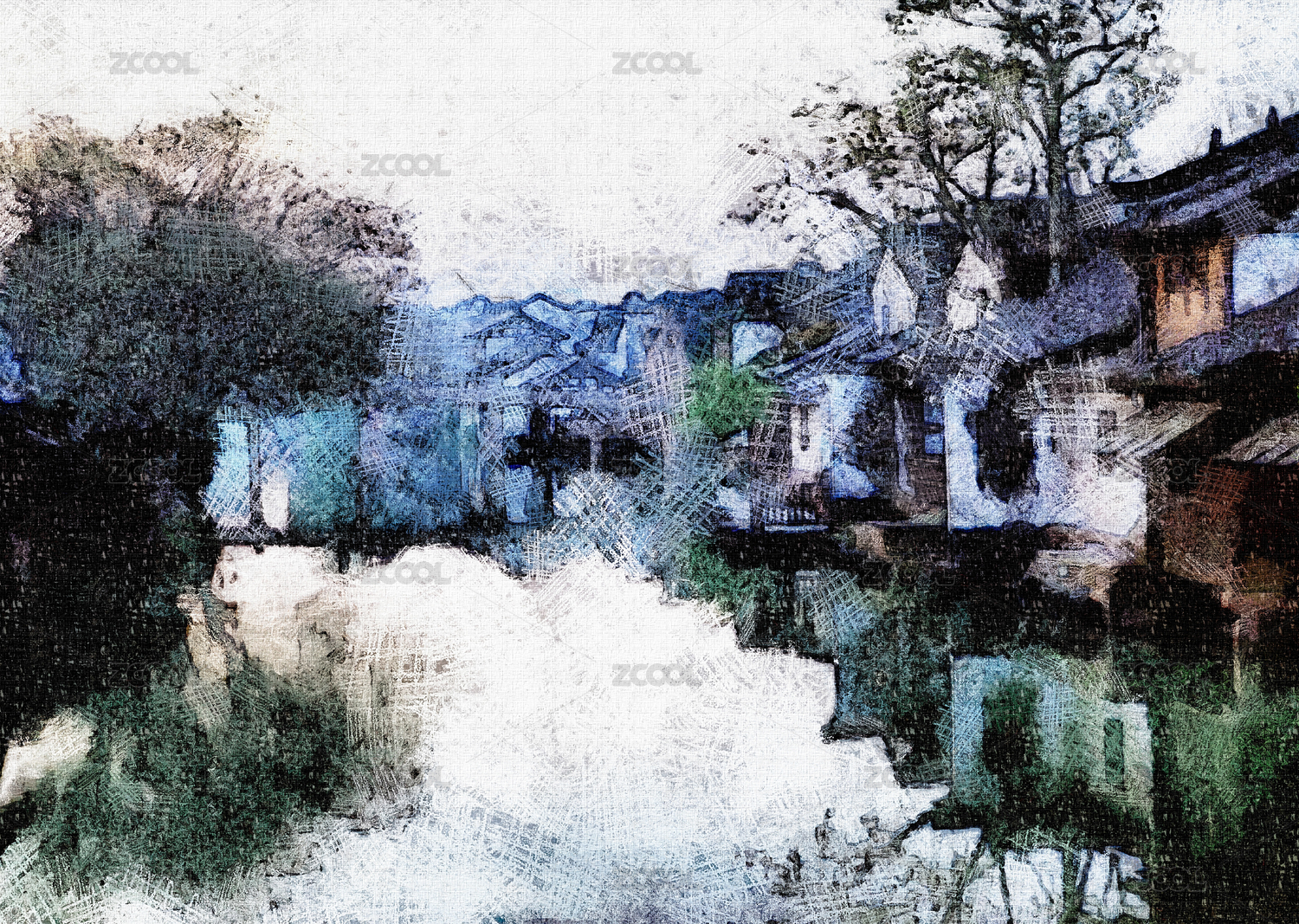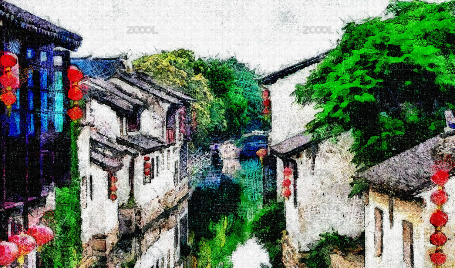 古镇,乌镇,古建筑,风景,江南,油画,装饰画,挂画,手绘,水墨