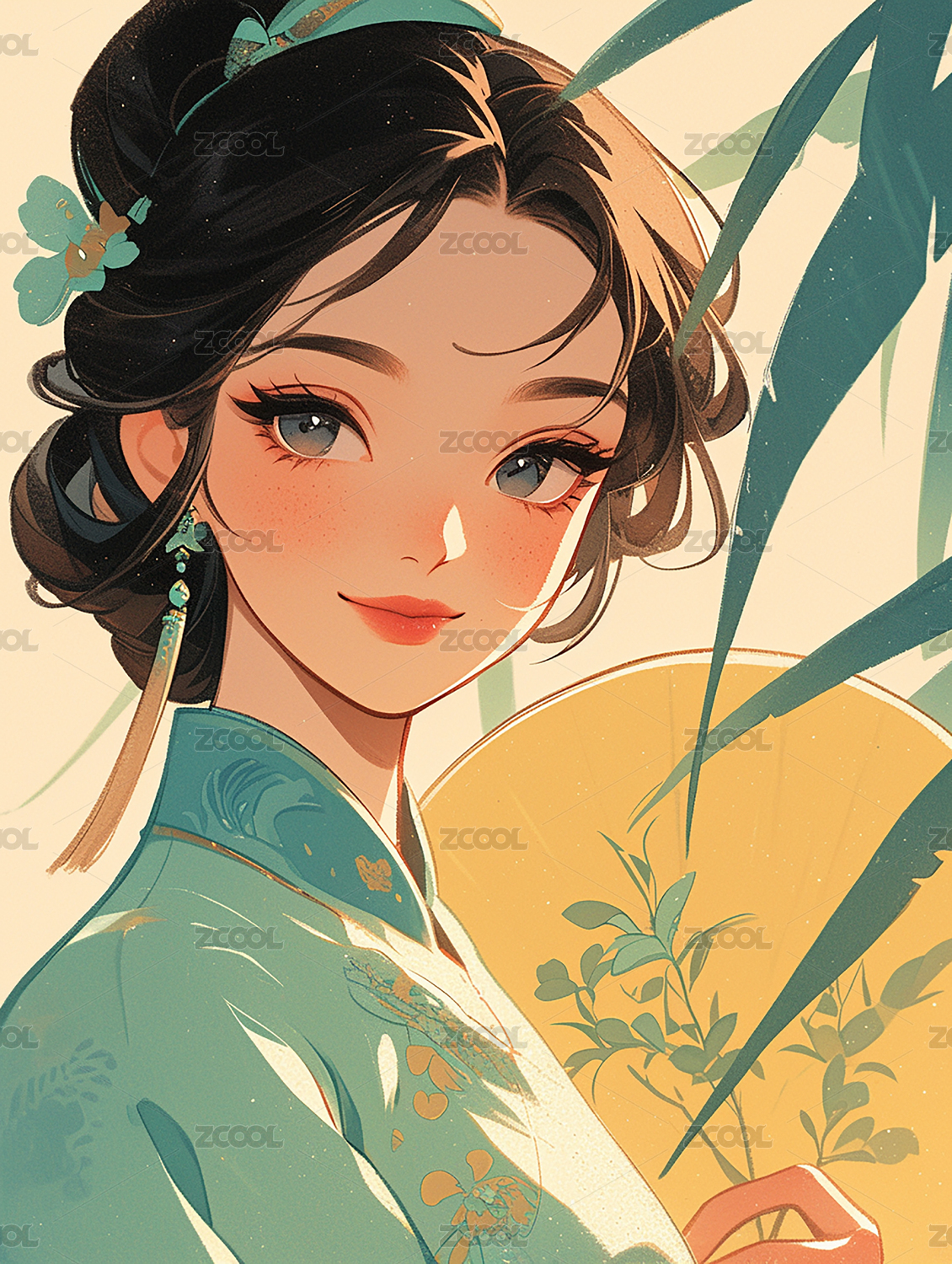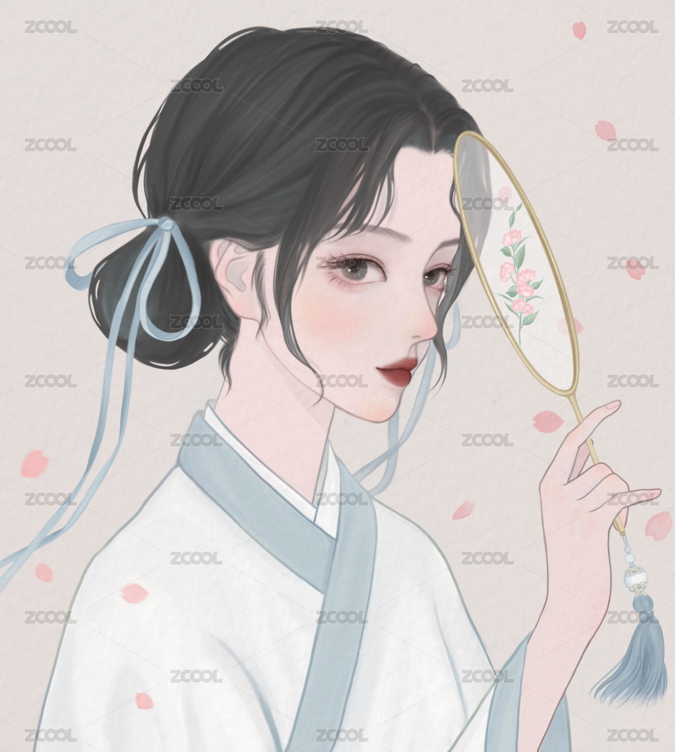 拿着团扇的古风女孩插画