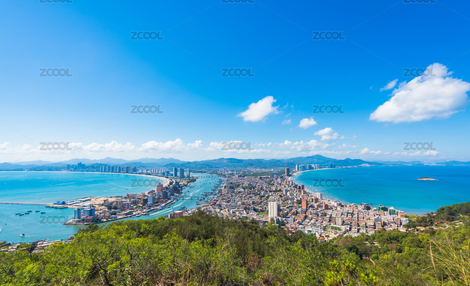 中国广东惠州双月湾夏日晴天全景图